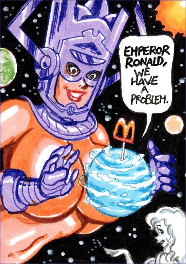 JG: Occasionally I’ll have an idea that I can’t condense to a single card so I’ll expand it to a sequence of multiple cards/panels and post them as a single auction. Other times, I’ll do a single card and get a good response to the theme and then continue the narrative with other single card offerings. Were I more organized I’d have themes a bit better planned out. 🙂