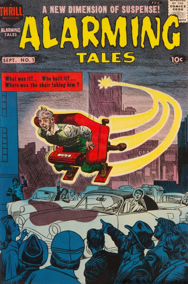 Both yarns appeared in this jam-packed. all-in-colour-for-a-dime wonder, Alarming Talesno. 1 (Sept. 1957, Harvey). I was fortunate enough to pick up a copy for peanuts, eons ago — but fret not, you can read it gratisright here.