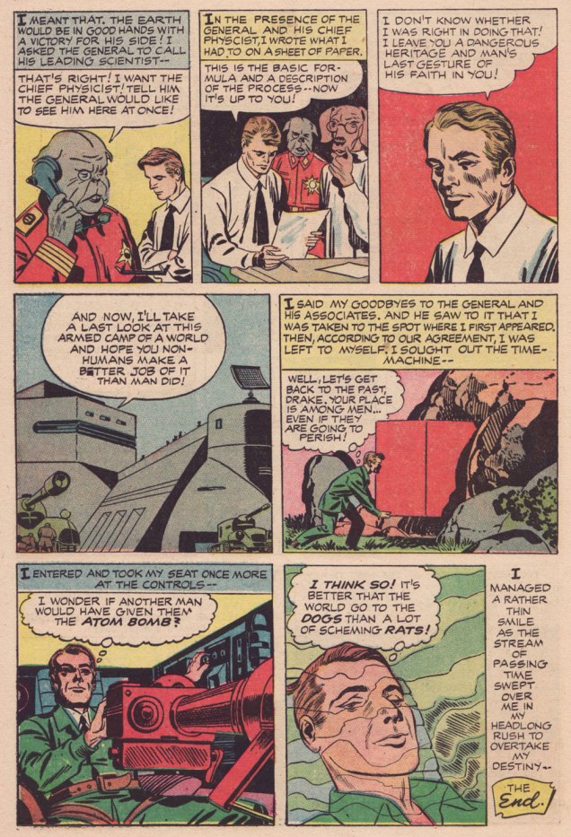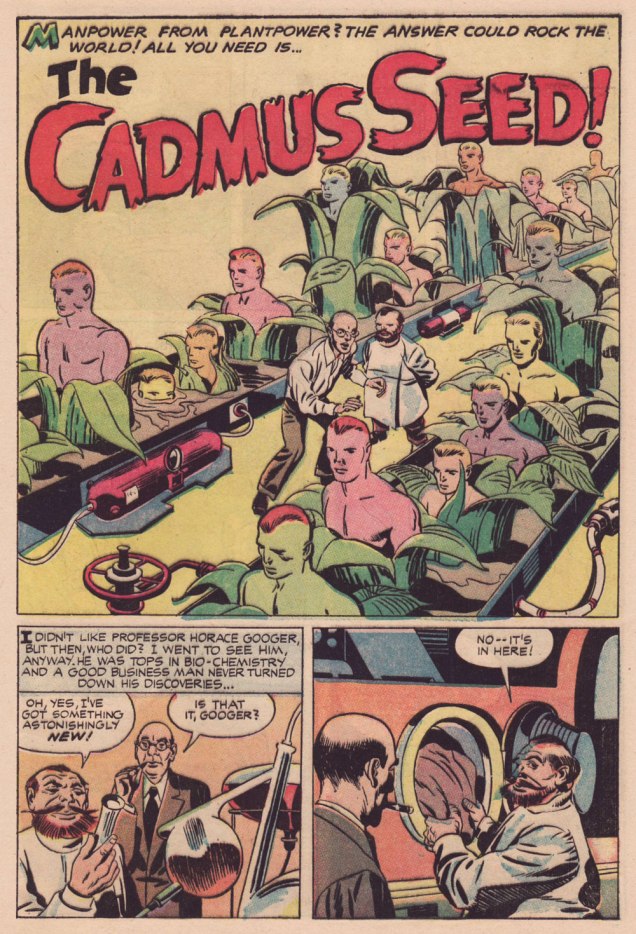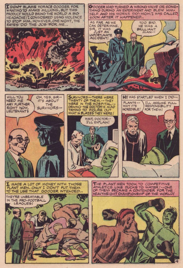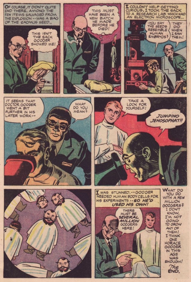 Here’s a second story, which I like even better, thanks to its humorous touches. Several of its plot ideas could have been expanded upon in OMAC, had Kirby been granted time and opportunity.