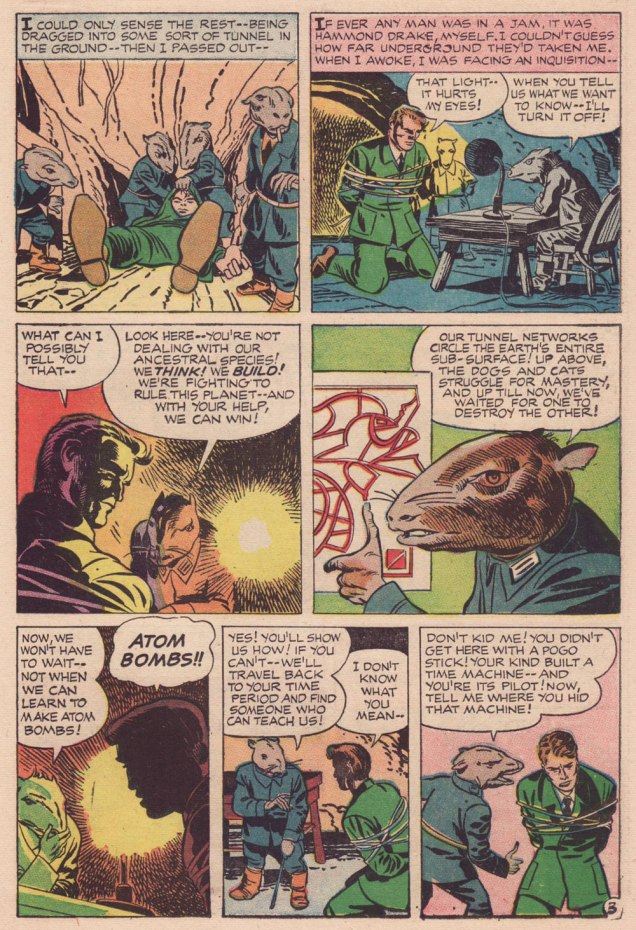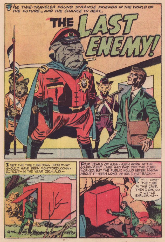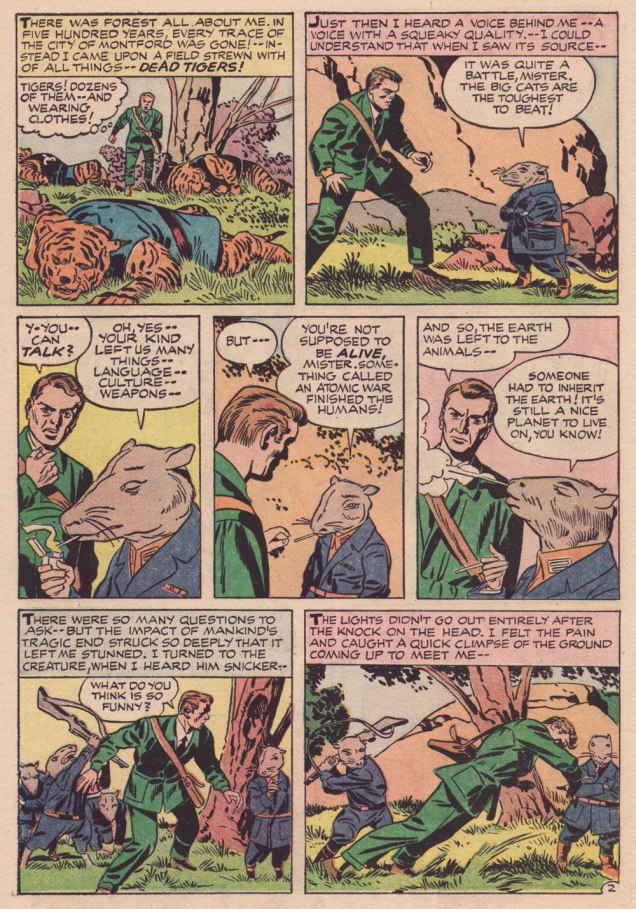 Kirby has often been unfairly slagged for ‘riffing on’ the popular Planet of the Apes franchise, but The Last Enemy predates the 1968 film’s source, Pierre Boulle‘s 1963 novel La planète des singes by some six years… and besides, the ‘animals taking over’ theme has a long history in science-fiction. To name but a pair of antecedents, there’s Lester Del Ray‘s The Faithful (from 1938) and Clifford Simak‘s City (linked stories published between 1944 and 1951 and amalgamated in 1952).