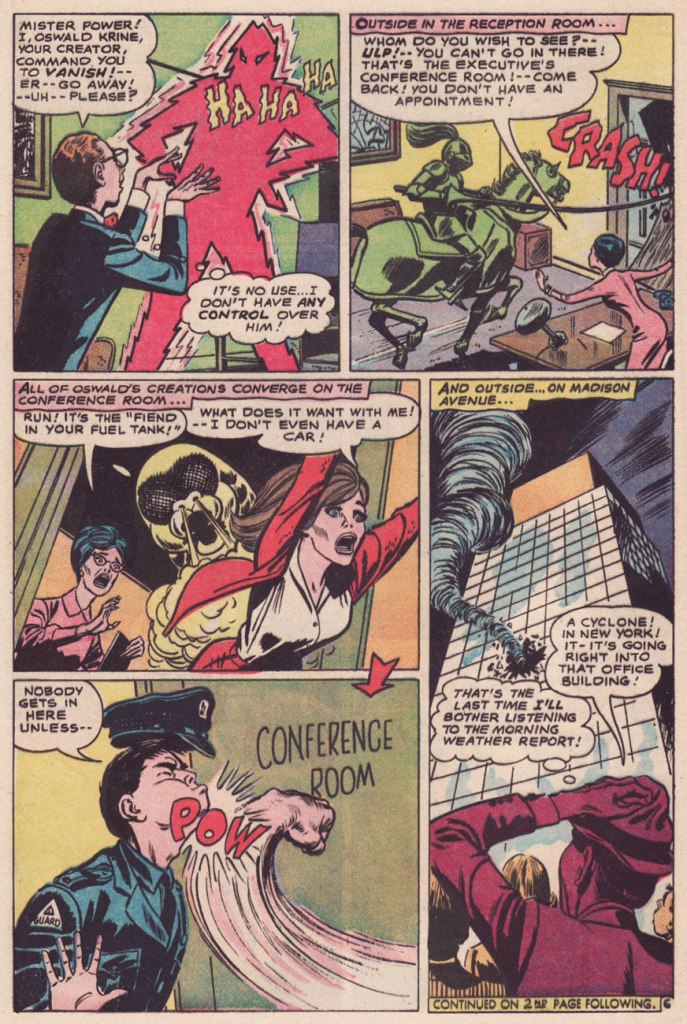 I do believe I can detect the Hughes cadence in The Monster Maker of Madison Avenue! According to GCD, the uncredited story is scripted by one Dennis Marks, an animation writer working for Filmation’s The Batman/Superman Hour at the time… but I just don’t know. It would be Marks’ sole comic book credit, and a speculative one at that. Besides, GCD attributes the artwork to Joe Orlando, which is flat-out, laughably wrong. A frequent problem of self-styled art experts is that they wear genre blinders. Most would never be caught dead reading, say, a romance comic, so they wouldn’t recognize (though they should!) the distinctive stylings of Jay Scott Pike (1924-2015).