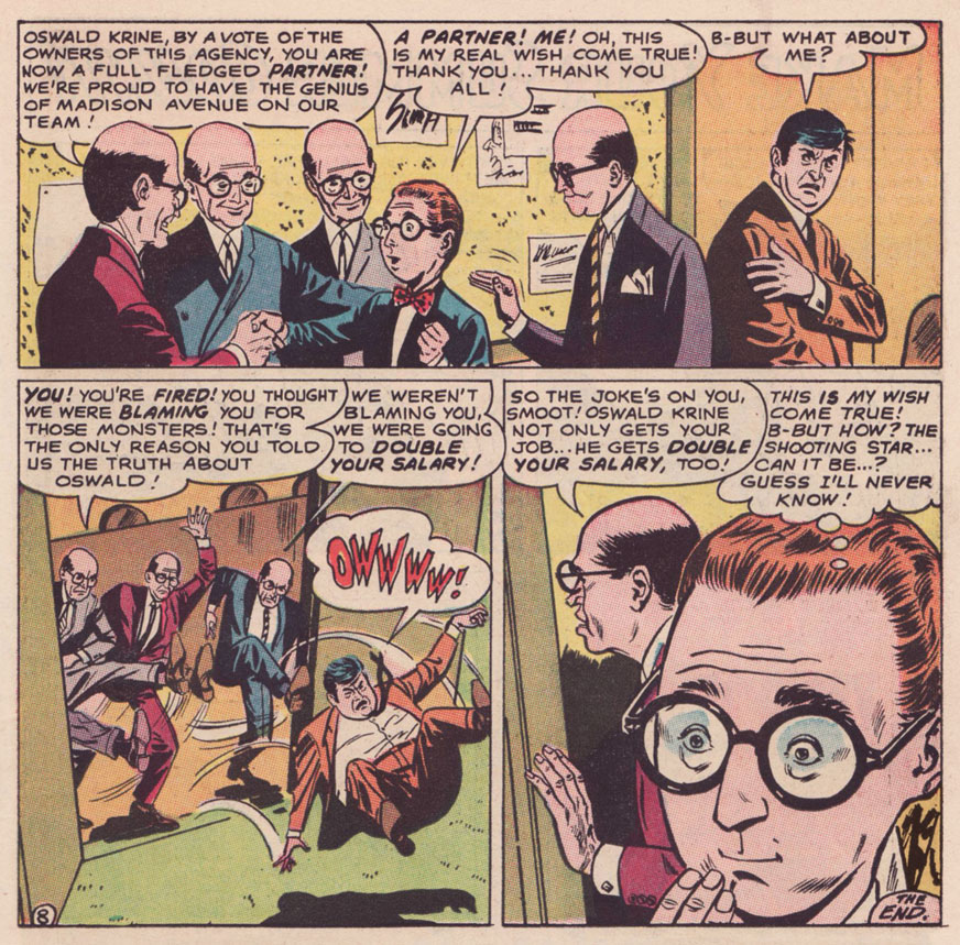 Meanwhile, DC Comics arguably boasted their singular genius humorist in Sheldon Mayer (Sugar and Spike). DC’s editors loved to divide and conquer, rarely allowing solo creators to take root, let alone flourish, in their tidy corporate garden patch. Given Mayer’s crucial early importance to the publisher’s rise, he was granted free(er) rein. Which leads one to ponder whether the assembly-line method, then, might not be utterly detrimental to quality humour.