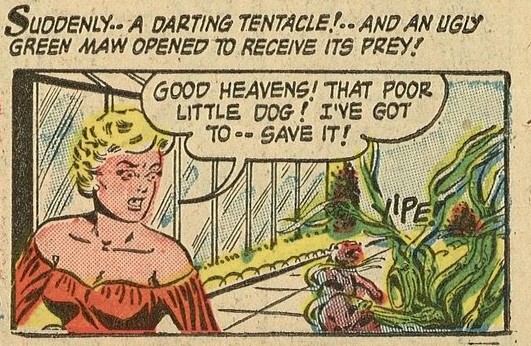 Another plant-tentacle offering from ACG comes from The Garden of Horror, illustrated by Lin Streeter, published in Adventures into the Unknown no. 48 (October 1953, ACG). This somewhat wordytale concerns itself with an archeologist who comes upon some strange seeds in a ruined temple in an unspecified ‘remote corner of Africa’. Arriving home, he plants them, and – surprise, surprise! – gets a little more than he bargained for. A dog is also involved, though this time it does not escape unscathed.