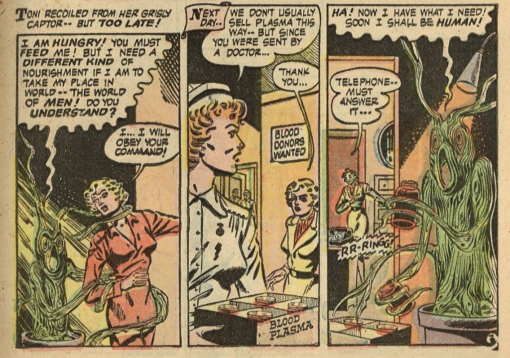An interesting plot point, revealed at the end of the story, is that the plant’s fervent desire to become human is explained by his love for Phil Benson, the young botanist. I kind of want to see a follow-up story about that couple and the problems a plant-man pairing would be confronted with. And the classy blonde? She can find somebody else to hang out with.
