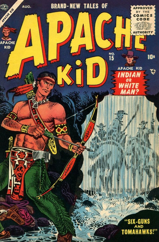 This is Apache Kid no. 15 (Aug. 1955, Atlas). The publisher also had in its roster Arizona Kid, Kid Colt, The Kid from Dodge City, The Kid from Texas, Kid Slade, The Outlaw Kid, Rawhide Kid, Ringo Kid, Texas Kid, Two-Gun Kid, The Gun-Barrel Kid… did someone say ‘redundant’? Why, yes, someone did.