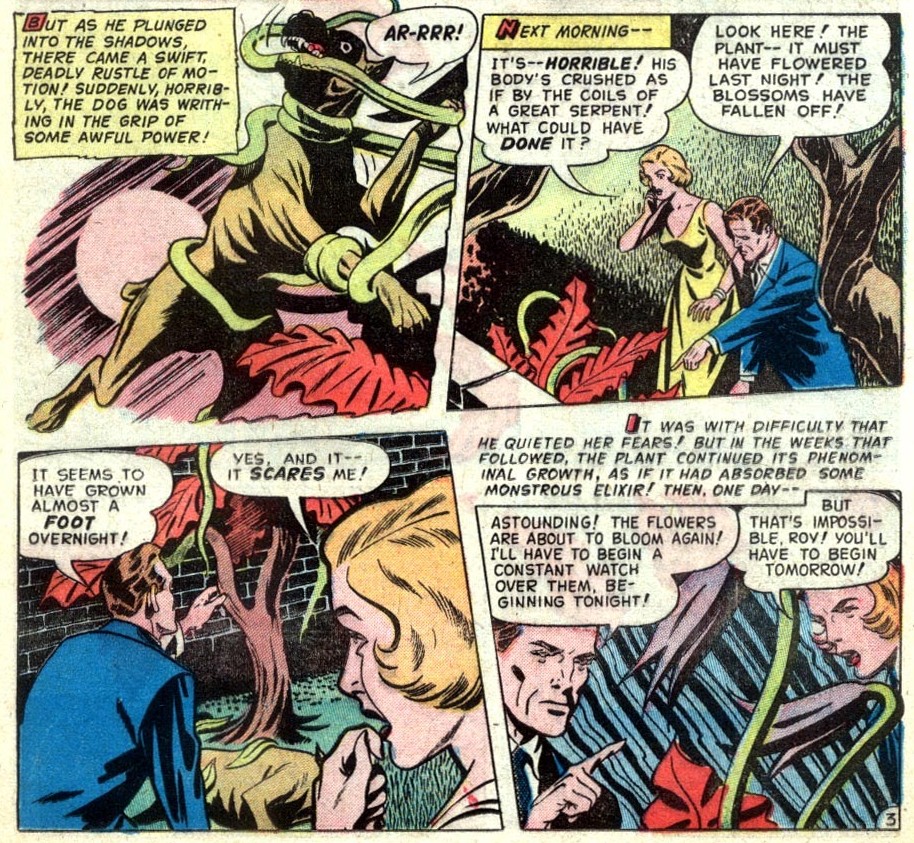 Carla gives her unscientifically-minded beau (strangely unconcerned with the killed dog, and later in the story, a similarly-dispatched burglar) an ultimatum: either he destroys this evil plant, or it’s all over between them! He chooses the plant – what the hell, she was a nag, anyway.