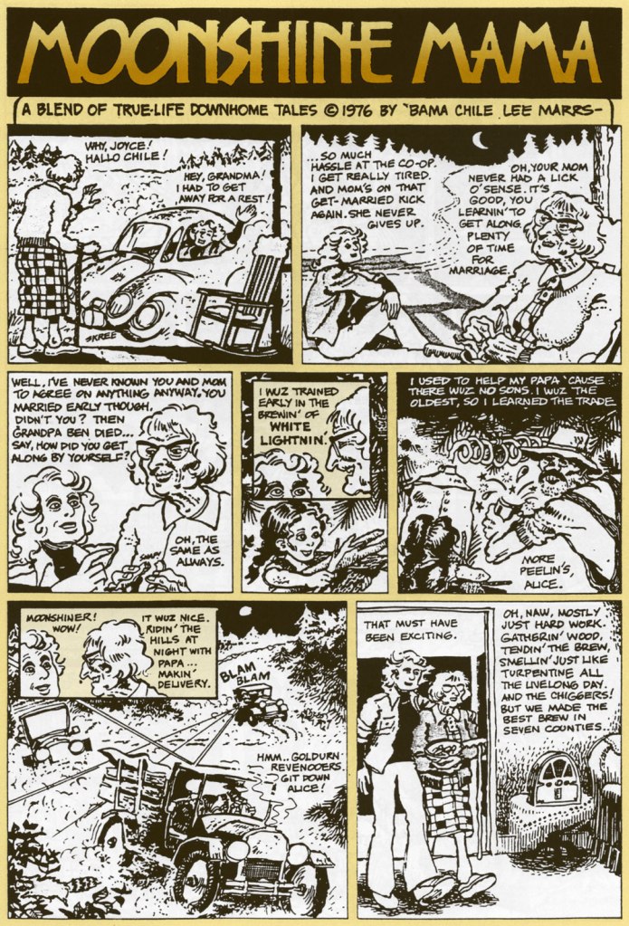 Lee Marrs (b. 1945) is not your typical « underground » cartoonist, though to be fair — what would a typical undergrounder be? The movement’s whole raison d’être was ‘vive la différence‘, wouldn’t you say?