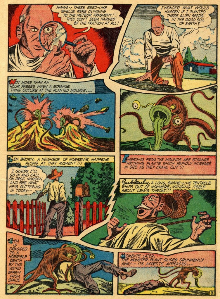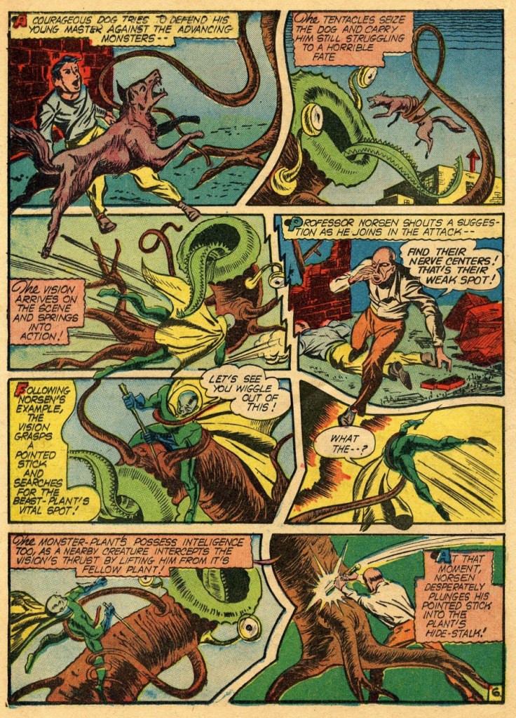Continuing the theme of the strangulated man and the tentacle-throttled dog, we have two pages from a The Vision story (without a title) published in Marvel Mystery Comics no. 26 (December 1941, Marvel). A scientist finds some strange seeds and plants them. Does that sound familiar?