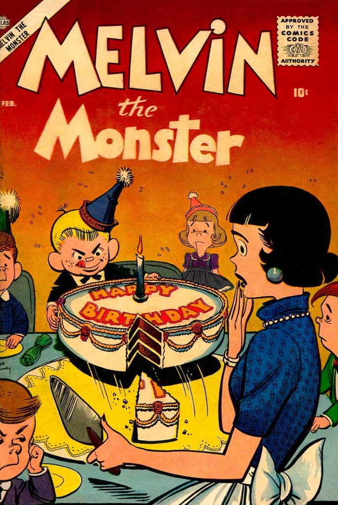 This is Melvin the Monster no. 4 (Feb. 1957, Atlas); Dr. Vassallo writes, in his in-depth Maneely overview for Alter Ego magazine (no. 28, Sept. 2003): « Stan Lee and Joe Maneely’s Melvin the Monster… duplicated everything they could about Hank Ketcham’s Dennis the Menace — art style, comic strip format, even upper-&-lower-case lettering style — everything except the warmth and innocence.»