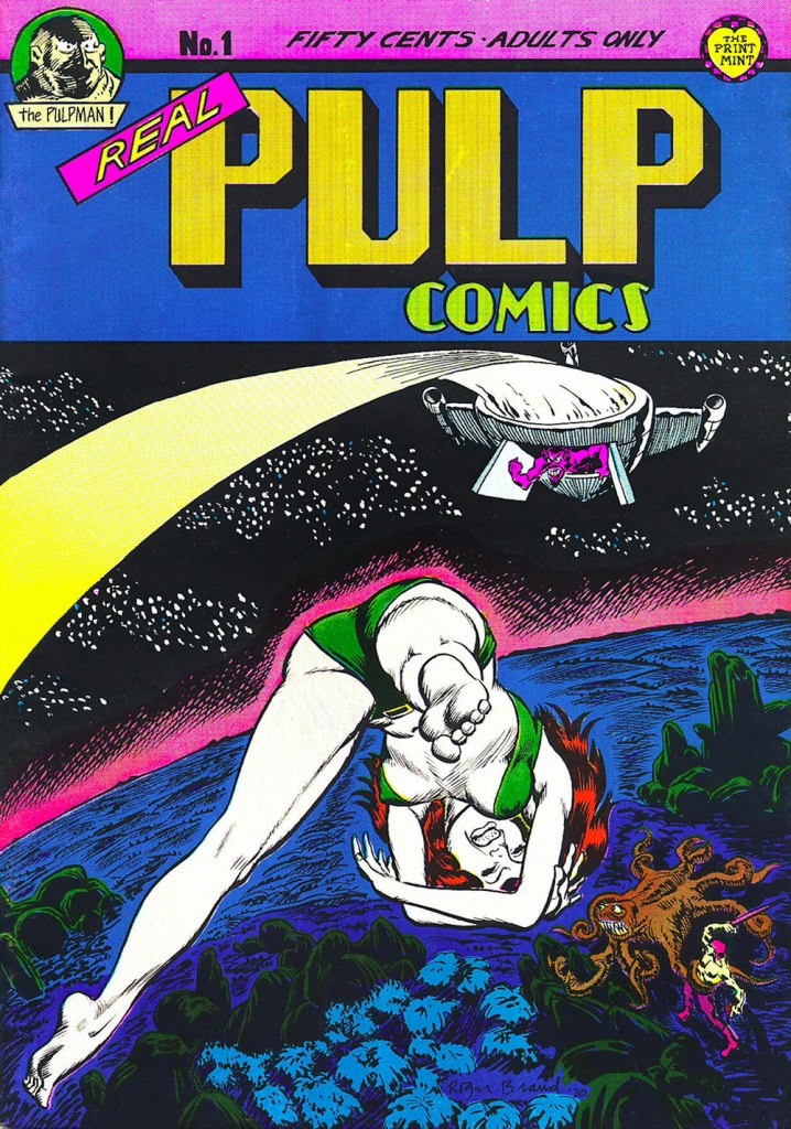 Real Pulp Comics no. 1 (January 1971, The Print Mint). Cover by Roger Brand, who tragically died at 42 – read a heartfelt panegyric from Kim Deitch in A Lousy Week for Woods (Remembering Roger Brand).