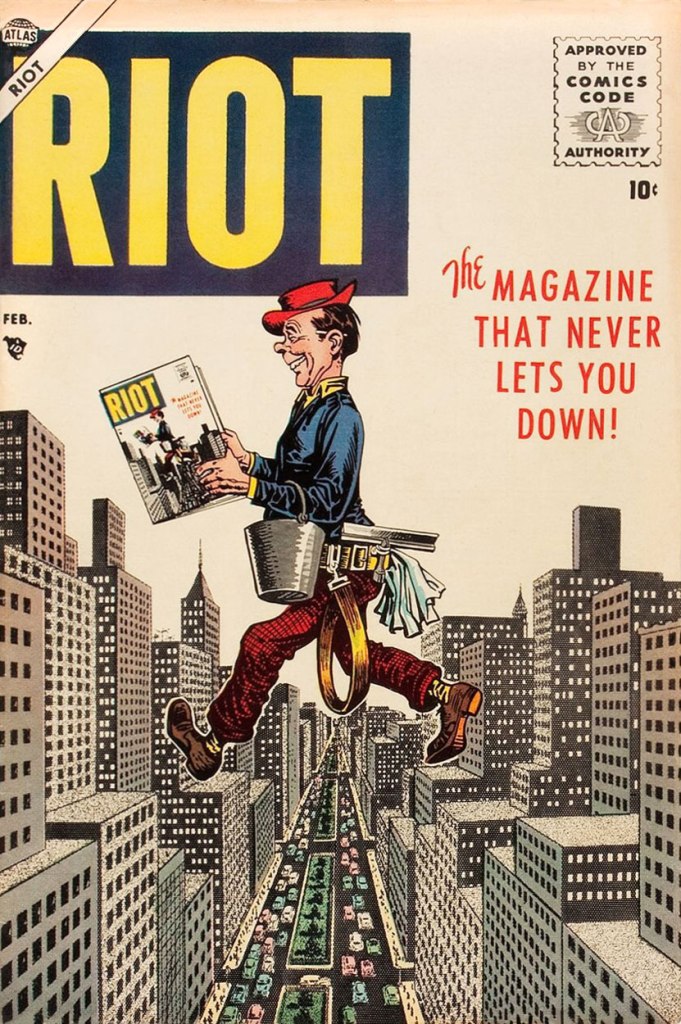 Atlas published, in quick succession, no less that four short-lived Mad clones: Crazy, Riot, Snafu and Wild, each lasting from three to seven issues. None were particularly funny either, even if they did look quite good. This is Riot no.4 (Feb. 1956, Atlas) featuring what is termed, in comic book circles, an ‘infinity’ cover.