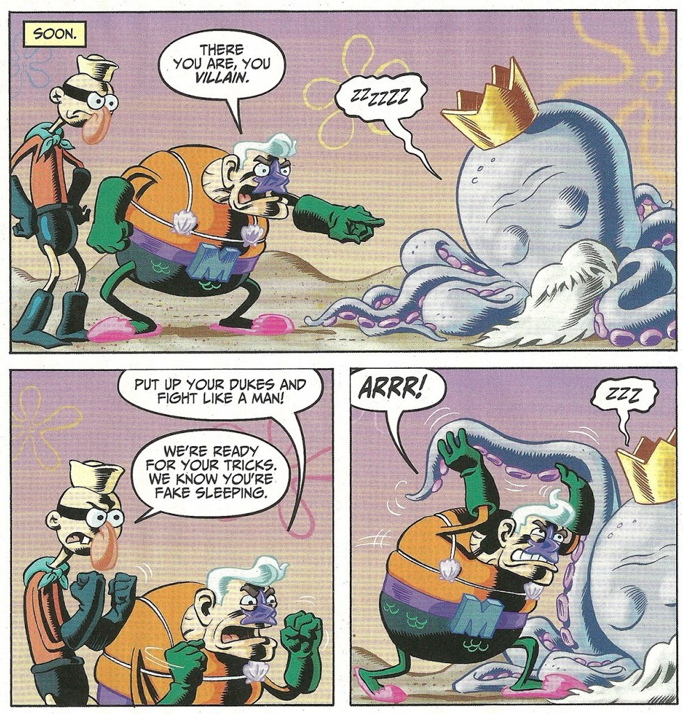 The tentacle fun starts right off with the first issue! Mermaid Man and Barnacle Boy vs. the Octopus King, written by James Kochalka and illustrated by Hilary Barta, was published in SpongeBob Comics No. 1 (February 2011):