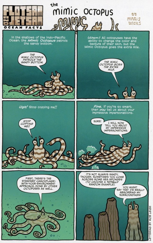 Flotsam and Jetsam: Ocean Facts – The Mimic Octopus, written and illustrated by Maris Wicks and published in SpongeBob Comics no. 52 (January 2016).