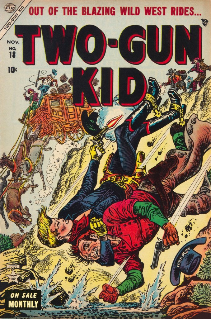 This is Two-Gun Kid no. 18 (Nov. 1954, Atlas). I doubt anyone’s going to land comfortably. Particularly those poor horses.