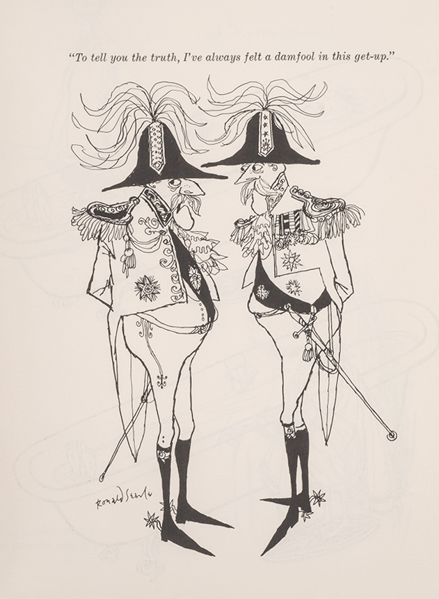 I was a little late to the party, and came to Searle’s in a rather circuitous fashion. In a used bookstore (isn’t how these things always start?), I noticed a book called The Grapes of Ralph: Wine According to Ralph Steadman (1996, Houghton Mifflin Harcourt), and was intrigued enough to purchase it. Steadman’s splotchy, wild style was perfect for a book about fermented grape juice – he frequently coloured his art in a manner reminiscent of wine stains, and the unhinged art hinted at the artist being more than slightly soused. Well… where, you may ask, does Searle come in? Steadman was heavily influenced by his style, so much so that for a while I embarrassingly thought that Grapes of Ralph was actually illustrated by the former.