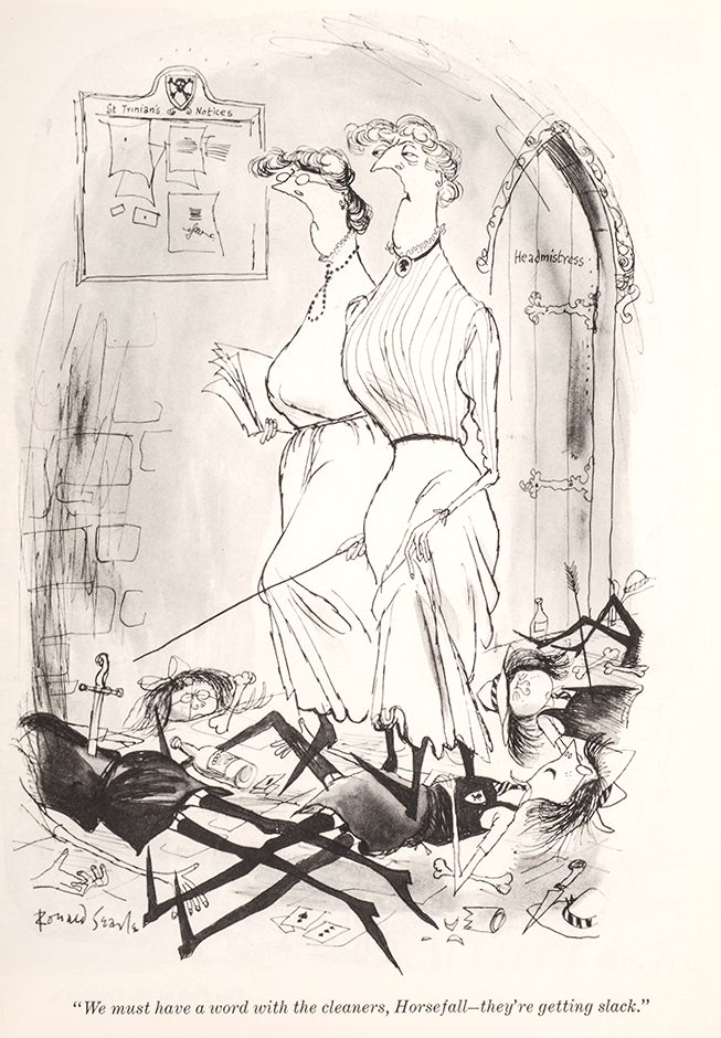 Searle died in 2011 in his beloved France, where he had been living since 1975. He was 91 years old, and spent his last years as a bit of a recluse (though still drawing), far away from the public’s eye – when he passed away, one got the impression that some thought he had done it already years ago. As for St Trinian’s, its popularity seems to sort-of, kind-of linger on: there was yet another movie in 2007, though I would posit that we need fewer movies, and more proper, hardcover reprints of the material that left an enduring trace in people’s memories.