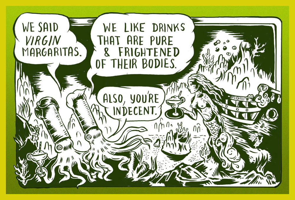 Ali Fitzgerald’s Bermuda Square waved its first ‘hi there!’ on May 16th, 2016 in the The Cut, one of New York Magazine‘s website-only divisions describing itself as ‘a site for women who want to view the latest fashion trends; read provocative takes on issues that matter, from politics to relationships; follow celebrity style icons; and preview new products.‘ I don’t believe Bermuda Square fits that neatly into any of these categories, though Iris the octopus is unarguably stylish, and politics and relationships are definitely involved. Does she and her siren friends ever try out some new face cream, or weighs the pros and cons of that foundation one sees ads for absolutely everywhere? Who knows – Bermuda Square strips only live behind The Cut’s pretty rigid paywall (not that I object to writers and illustrators actually being paid, but I would much rather buy a collection of strips than a subscription to an online-only lifestyle magazine – call me old-fashioned).