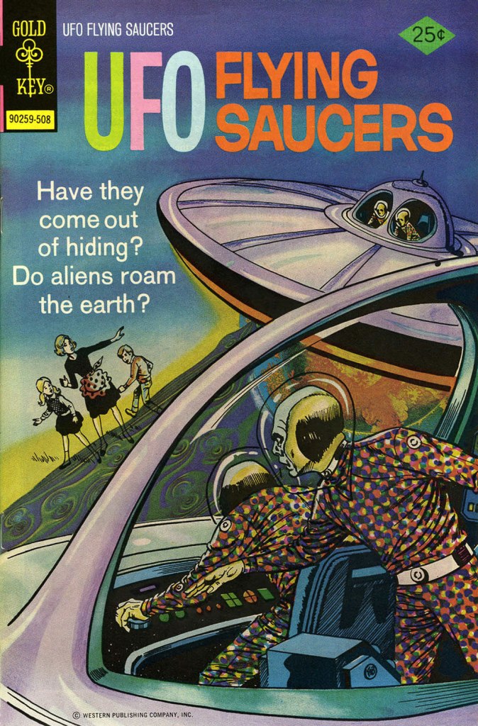 You can follow the rising pitch with the publishing frequency of Gold Key’s UFO Flying Saucers: after its premiere issue hits the stands in 1968, two full years elapsed until the second, then another two until the third… and again to the fourth. It’s fair to presume that the title had been intended as a one-shot, and that encouraging sales led the way to a regular, if sparse schedule. Then the pace picked up after issue four (Nov. 1974), and so ten issues appeared in the span of just over three years. There was a brief hiatus, a retitling to UFO & Outer Space and a further dozen issues saw print, two of them reprints. By late 1979, the series sputtered to a halt.