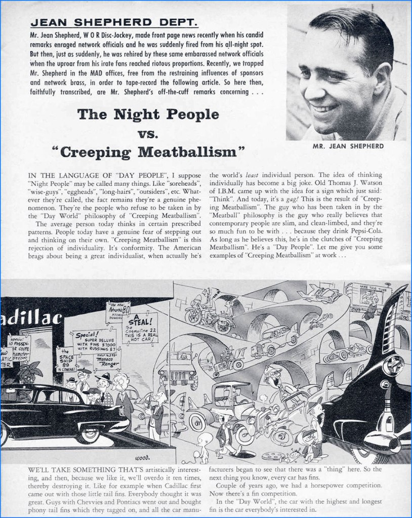 Seldom seen since its publication, this was Shepherd’s collaboration with Wally Wood at the height of his powers. The Night People vs. “Creeping Meatballism“ appeared in Mad Magazine no. 32 (Apr. 1957, EC).