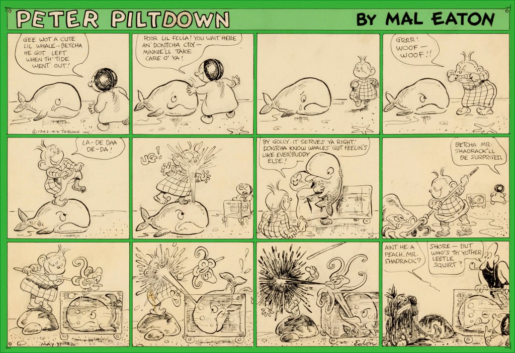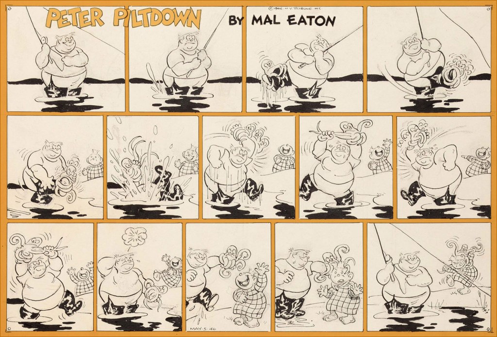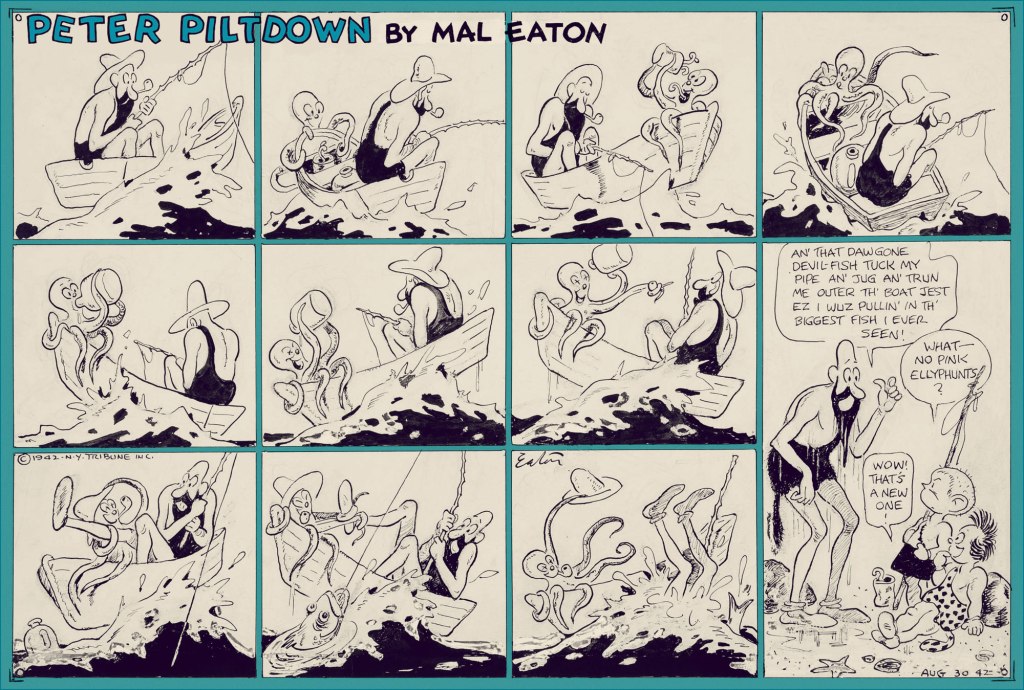 It’s time for a Peter Piltdown Tentacle Tuesday! We have previously written about Peter Piltdown, Mal Eaton’s nearly forgotten strip, but a few Sundays were kept in reserve for very obvious (tentacular!) reasons. Given the paucity of these strips, I am truly amazed that the original art of four octopus strips is available online. Eaton has a great ease with depicting flexible, expressive tentacles, so I am very pleased to be able to raise him to the rank of a 🐙Tentacle Master🐙!