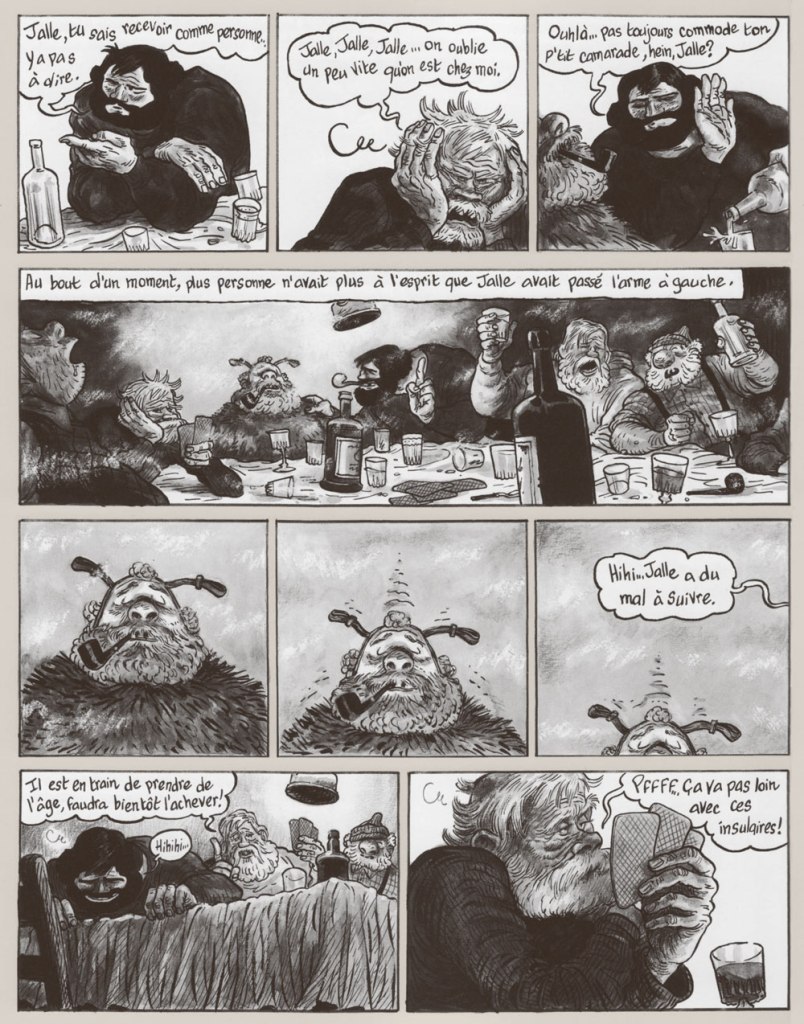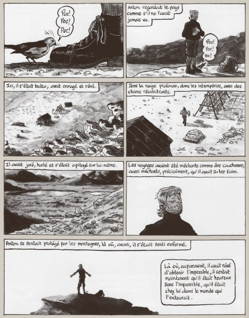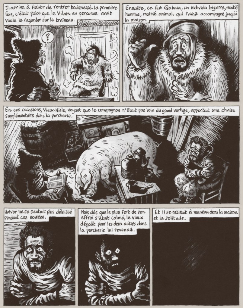 Of this adaptation, Jørn Riel said: « Opening this book is like opening the door to the arctic world as I knew it so many years ago. The trappers in these drawings are exactly as I discovered them then, and to meet them anew this way was both a surprise and a source of great joy. I thank with all my heart the authors and publisher. The trappers of Northeastern Greenland have been resurrected. » Let’s not underestimate the resilience and backbone of such men: after all, the vaunted Vikings gave up living there… because conditions were too harsh for their tender hides.