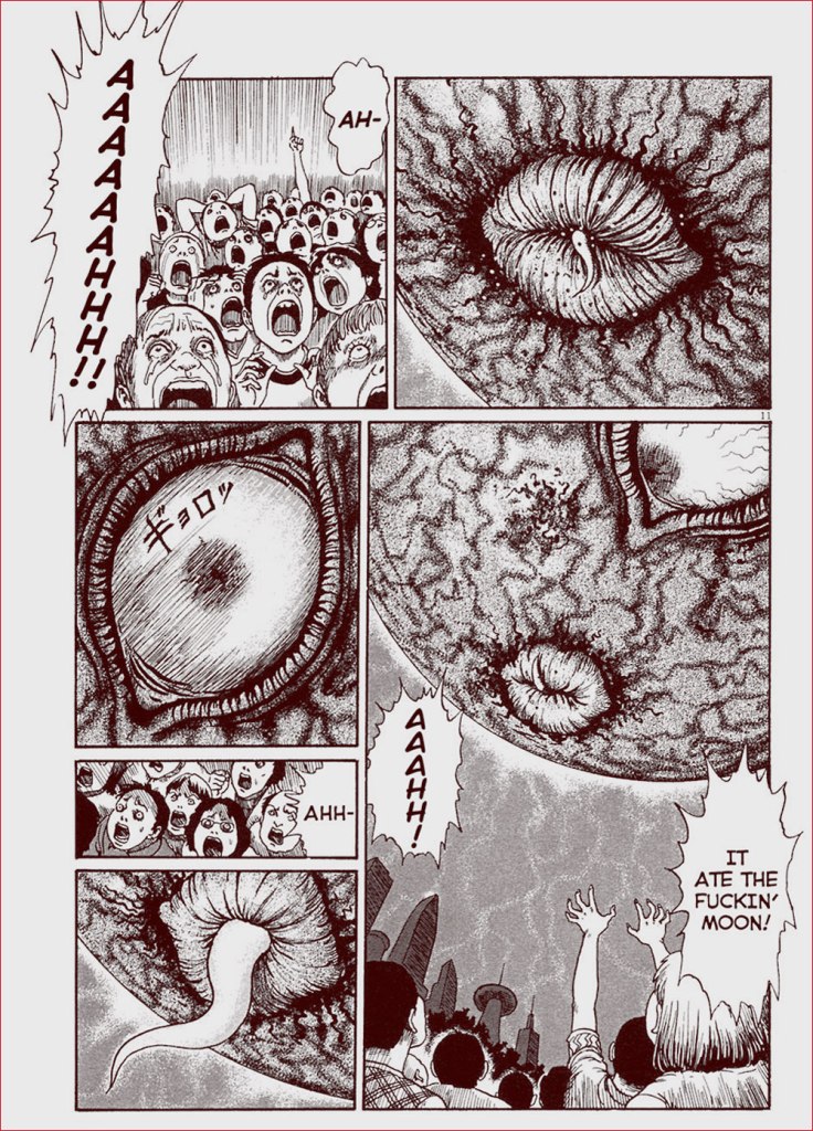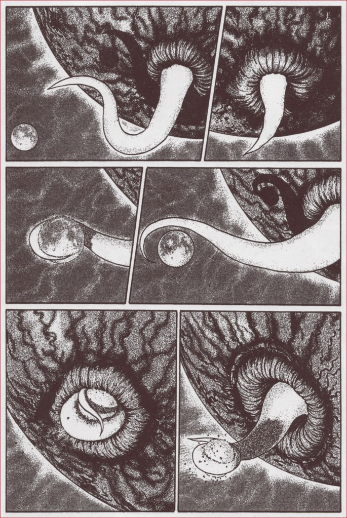 This is a scan from a previous edition of Remina, where the translators were a little looser with language. In the book I have, a laconic ‘it ate the moon‘ is substituted for ‘it ate the fuckin’ moon!‘.