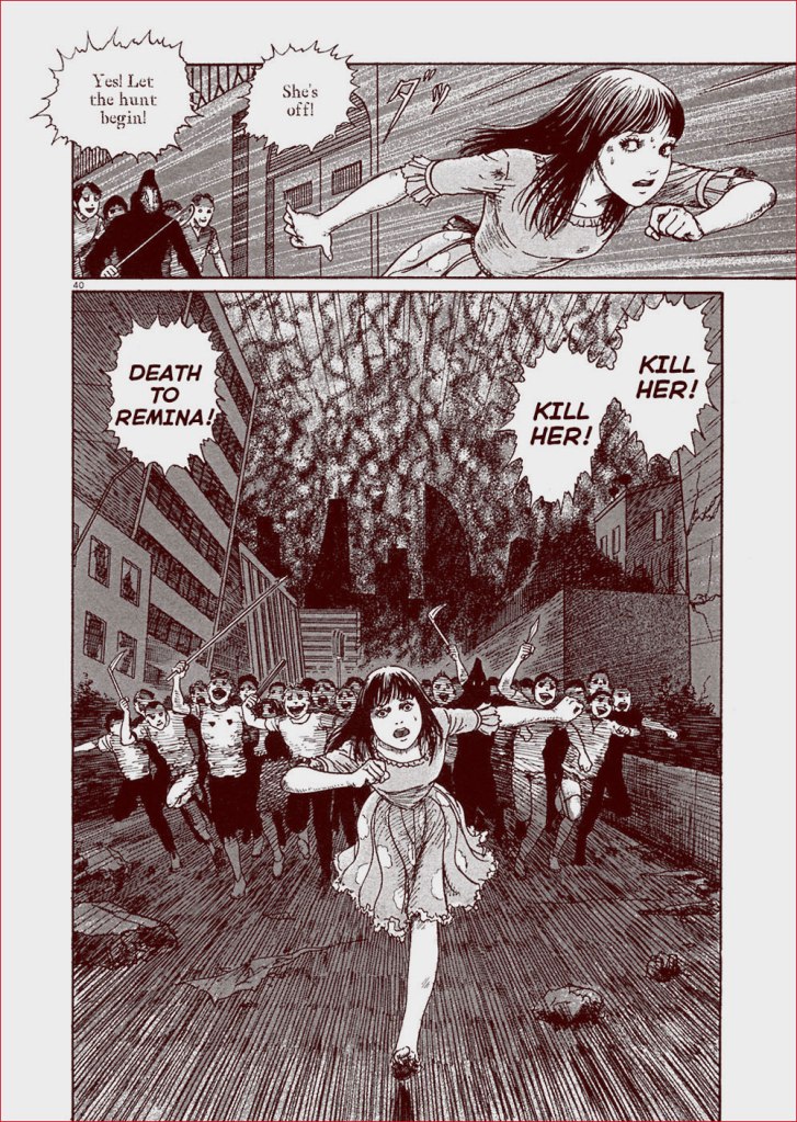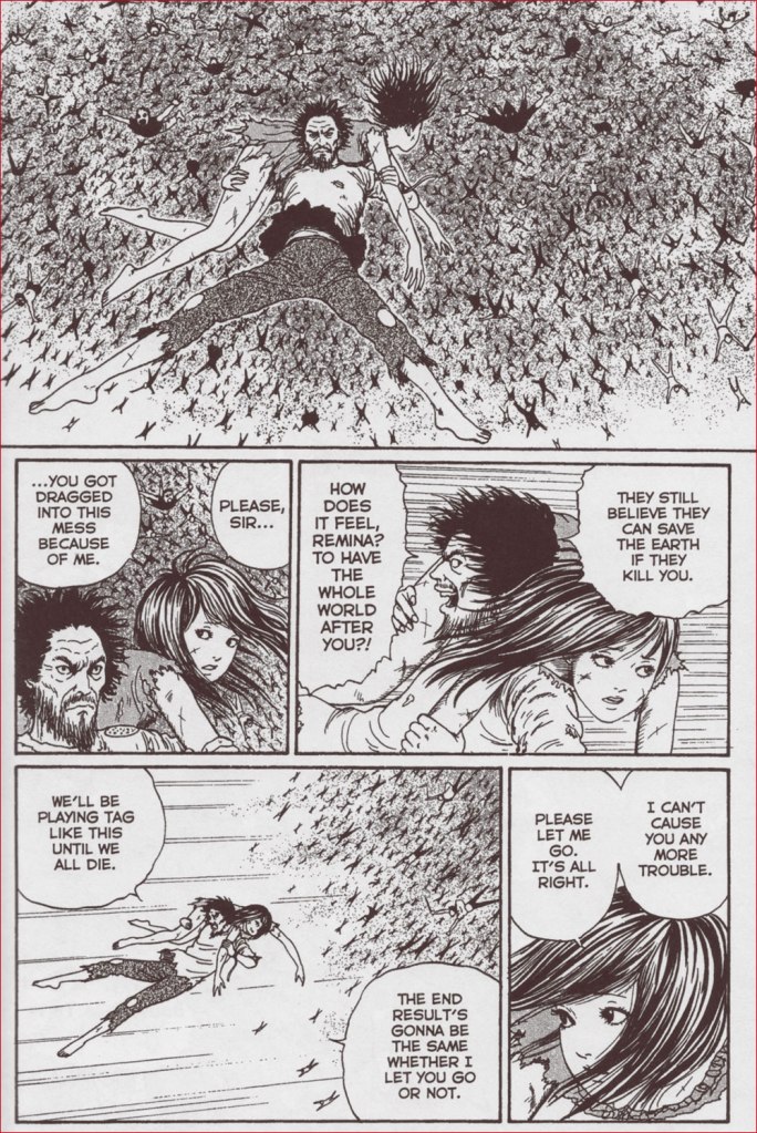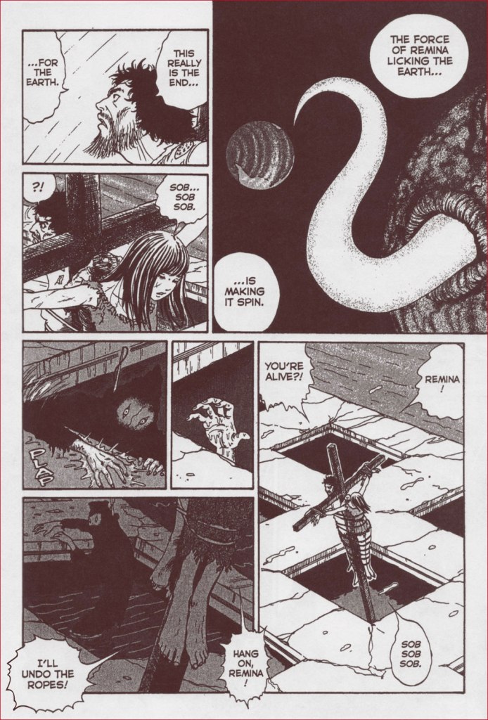 It doesn’t help that Remina, like a lot of Ito’s pretty creations, doesn’t really have a personality. She just sobs, screams for her daddy and her lost love (the manager, who apparently she was profoundly in love with), and implores people to just leave her alone. Scenes of crucifixion and the creepy robes worn by her pursuers indeed suggest religious fervour – as the earth’s gravity changes, cities are destroyed, volcanoes erupt etc., the only thing almost everybody is interested in is Remina’s mutilation and dismemberment.