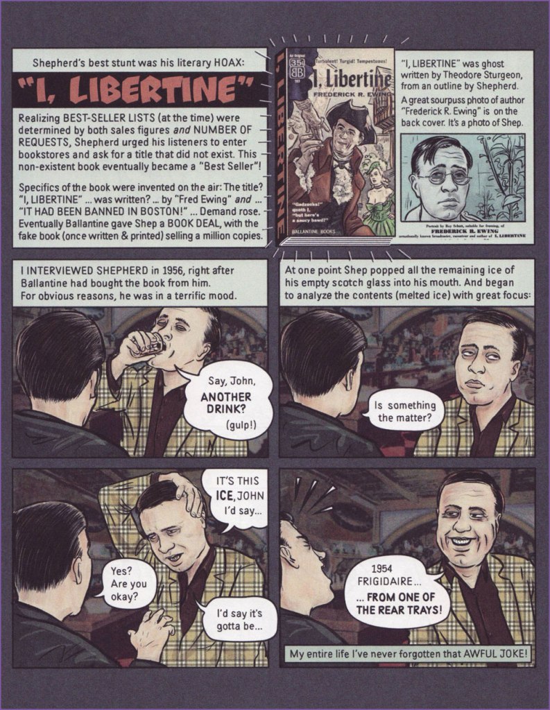 Another interesting comics connection: In Foibles‘ opening track, [ hear it here] Shep recalls an old favourite: « How many of you remember ol’ Peter Pain? He used to work in the comic strips, you remember, in those little strips that appeared under Moon Mullins, under The Gumps? He was green, was shaped like a pickle, he had stubble all over, he wore a black derby. He was a tremendous figure… a great American! He was the first Beat Poet. » Here’s one of Peter’s misadventures, circa 1948, illustrated by Jack Betts. You’ll find many more of these entertaining ads on Ger Apeldoorn’s highly-recommended blog, The Fabulous Fifties.