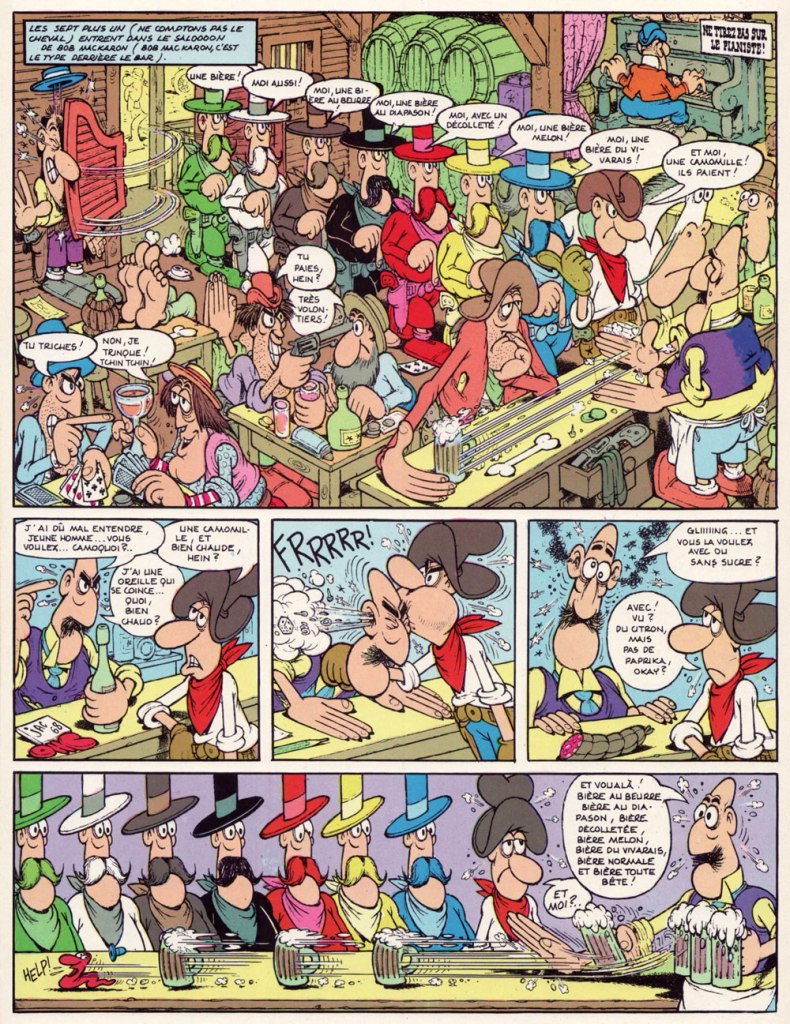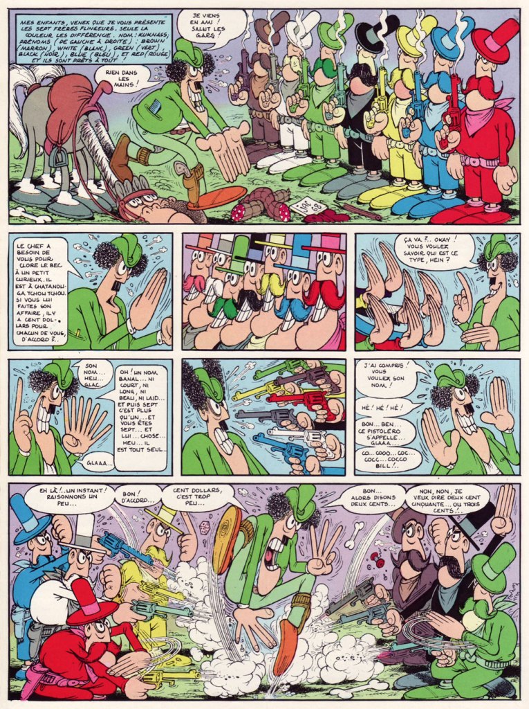 The sign says: “Do not trample the cacti“. The surviving bushwacker is put out of his misery by the gang’s second-in-command, the Chaplinesque Kruel; you know he’s a villain of substance because he rides a double horse. Pray note the lovely SALOOOOOOOOOOOOOOOOOOON sign with its behatted snake carvings.Meet hired guns the Kuknass Brothers: Brown, White, Green, Black, Yellow, Blue and Red, of course. Like the idea, Quentin? Note the extra digits (the better to count with, panel five). It’s easy to imagine Jacovitti having some influence on Mad’s Don Martin… In the manner of many a pure-hearted cowboy, Cocco Bill’s brew of choice is alcohol-free; his poison is chamomile tea, a drink with numerous health benefits! With sugar and lemon, but hold the paprika, thank you! Note: Don’t Shoot the Piano Player!This is Sur les rails (1975, JC Lattès, France), originally serialised in Corriere dei Piccoli as “Cocco Bill sulle rotaie”, 1969. In Italy, it was number twenty-one in the series.The train meets the stagecoach, and how! A page from Sur les rails.