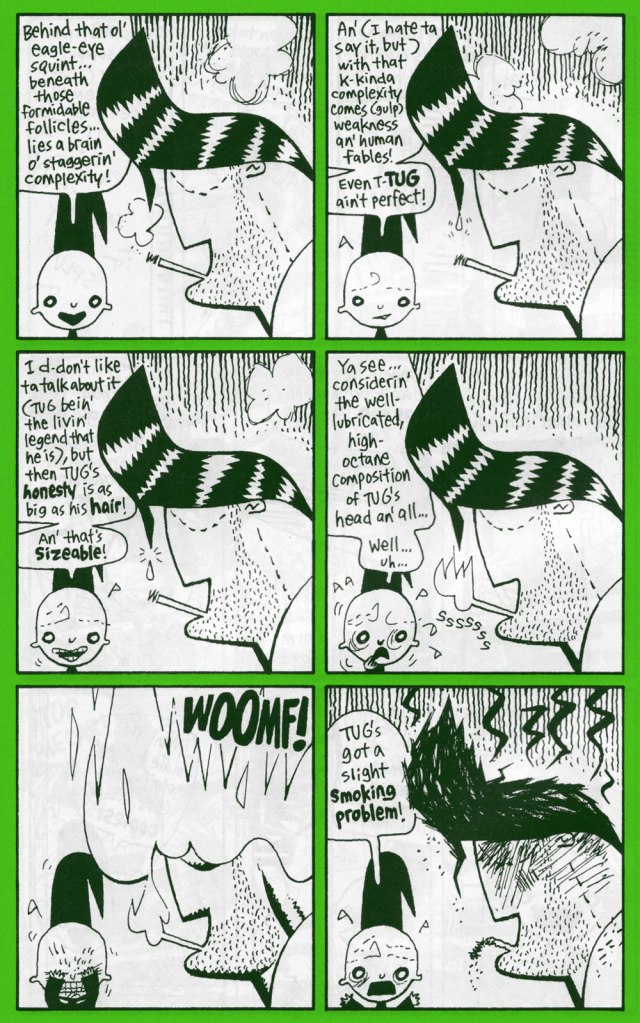 The capitalisation was presumably meant to emphasise Tug’s larger-than-life stature, while Buster’s lower case seems to poke fun at the kid’s weeness, both physical and emotional. Overcompensating for Tug’s laconic nature (he does not utter a single word), Buster prattles on like a broken record about manliness and nookie, simultaneously functioning as a sort of inner monologue narrator for Tug. That the latter most likely doesn’t have an inner monologue is irrelevant.