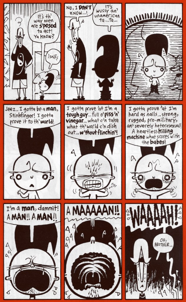 If one were to disengage Buster from his general obsession with Tug – a truly painful process which would require more than one scalpel – and peek under the crackling veneer of his machismo, one would discover that he’s actually not nearly as dopey as he seems. He just has a very precise (and very wrong) idea of what constitutes a man.