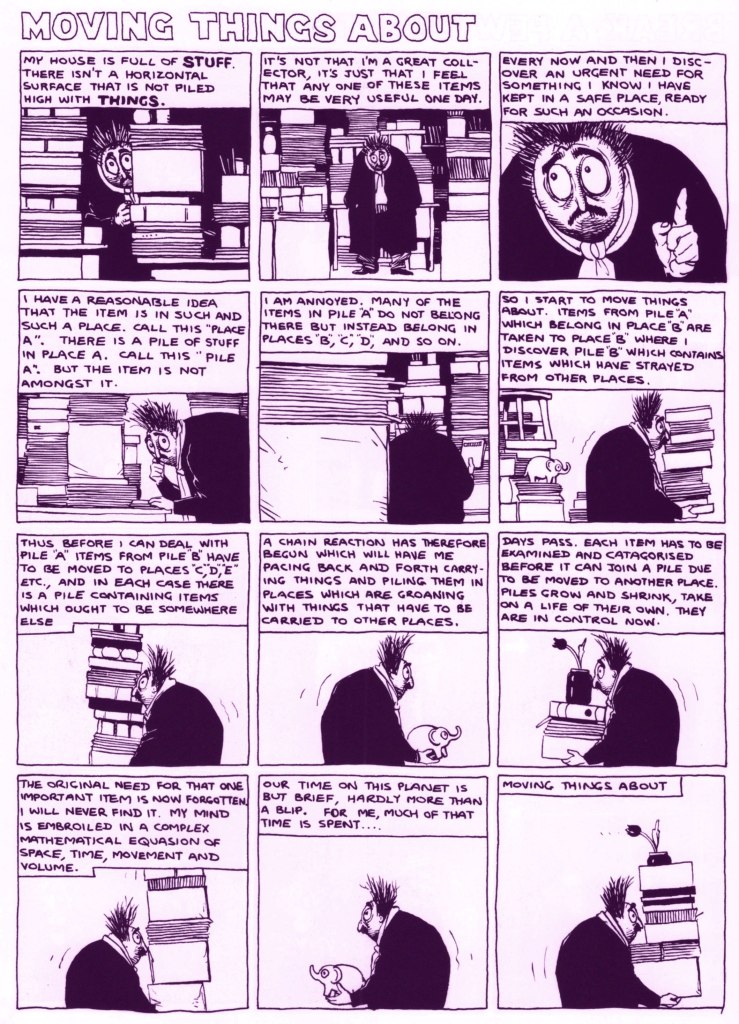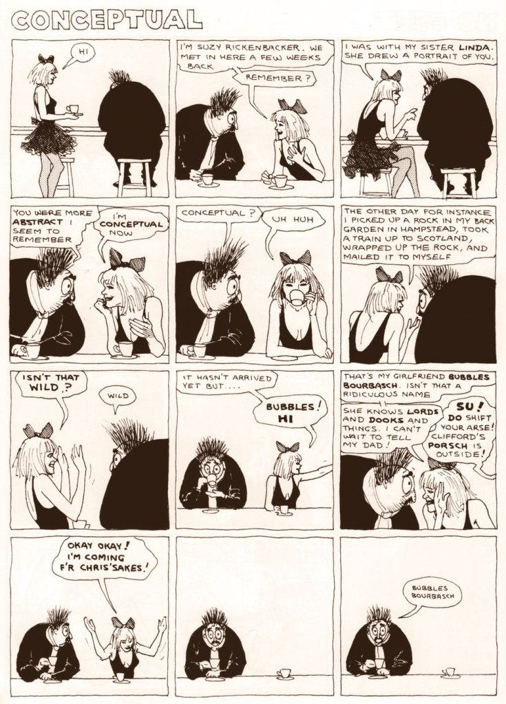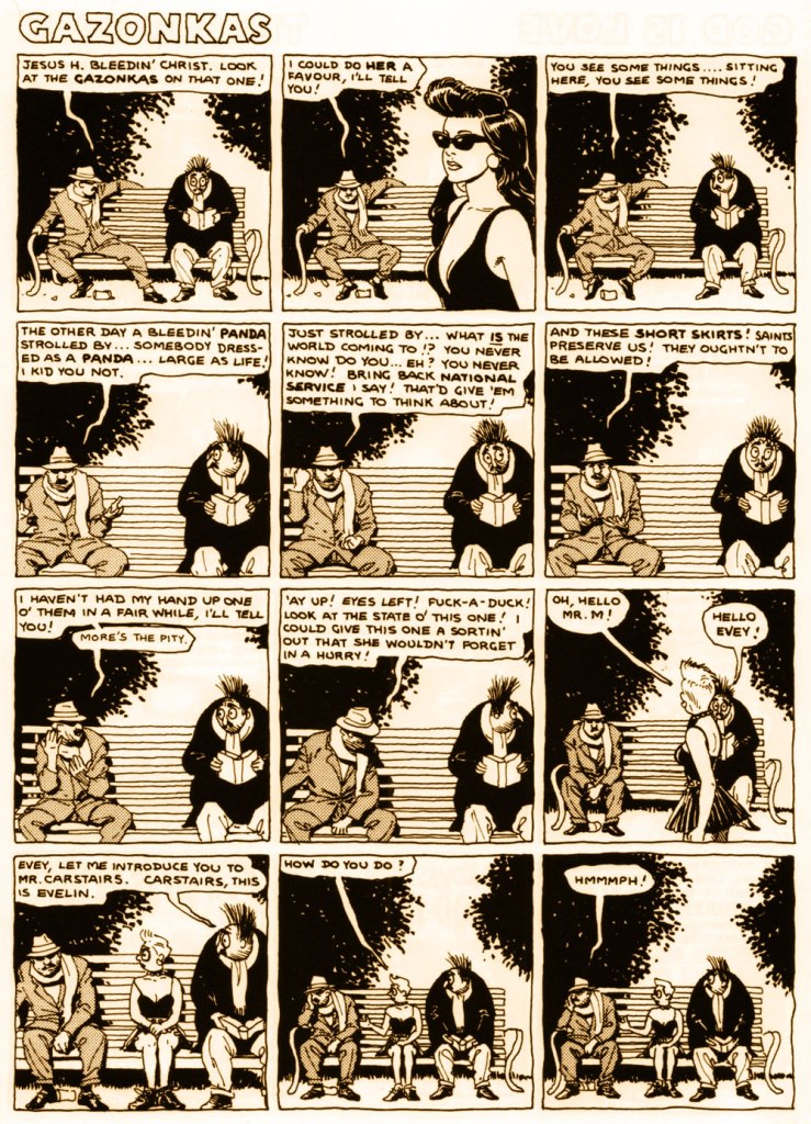 In terms of style, both in terms of art and storytelling, I suppose this strip fits comfortably into a set of British semi-autobiographical strips from the mid to late 80s – Eddie Cambpell’s Alec and Glenn Dakin’s Abraham Rat, for example, both of them also gloriously funny and contemplative and excellent. As a matter of fact, Mr. Mamoulian was first published in Paul Gravett‘s Escape Magazine* (read a lovely article about it here**), home of Cambell and Dakin’s strips as well…