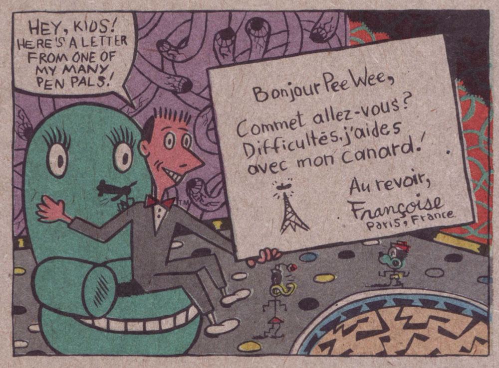 This momentous occasion took place on the back of card no. 18 (of 33) from Topps’ delirious Pee-wee’s Playhouse set (1988). Introductions were arranged by that dapper bon vivant, Mark Newgarden.