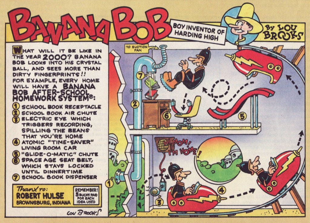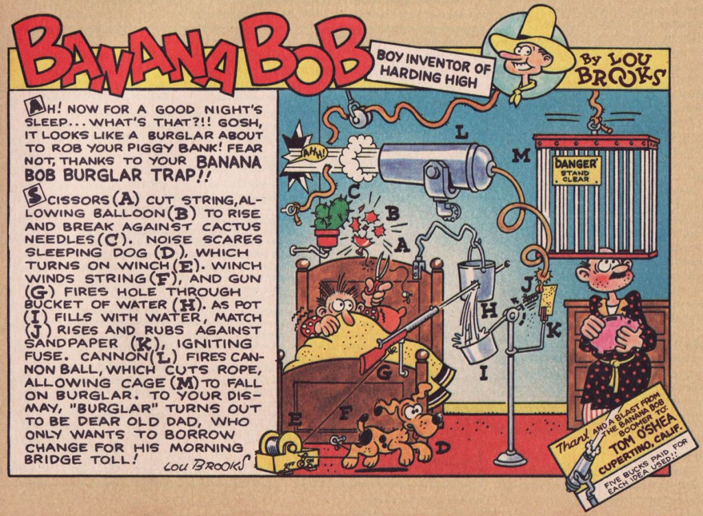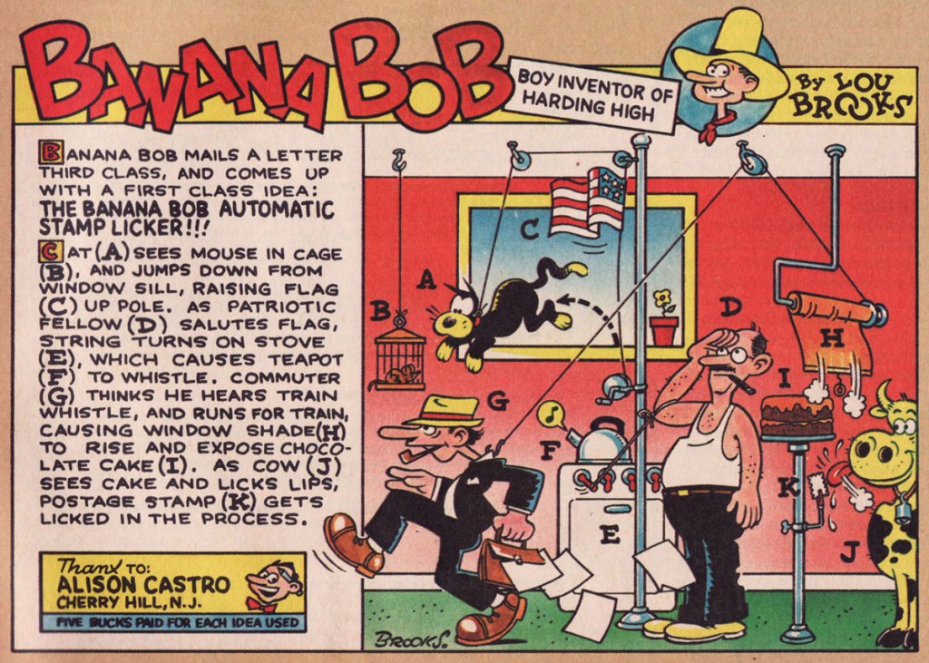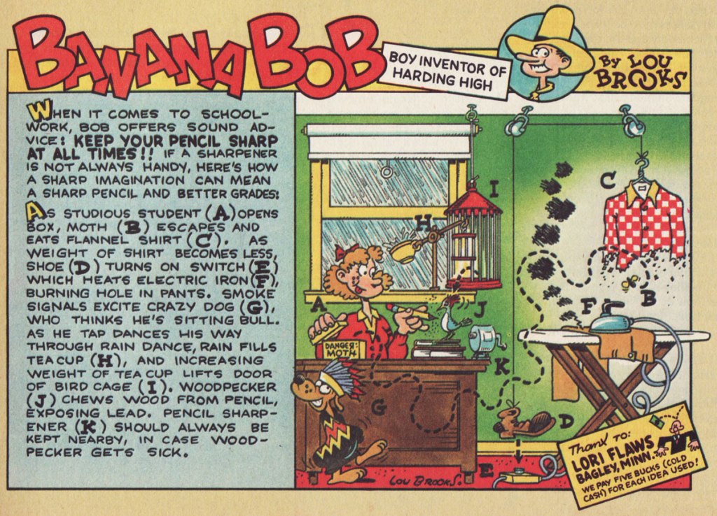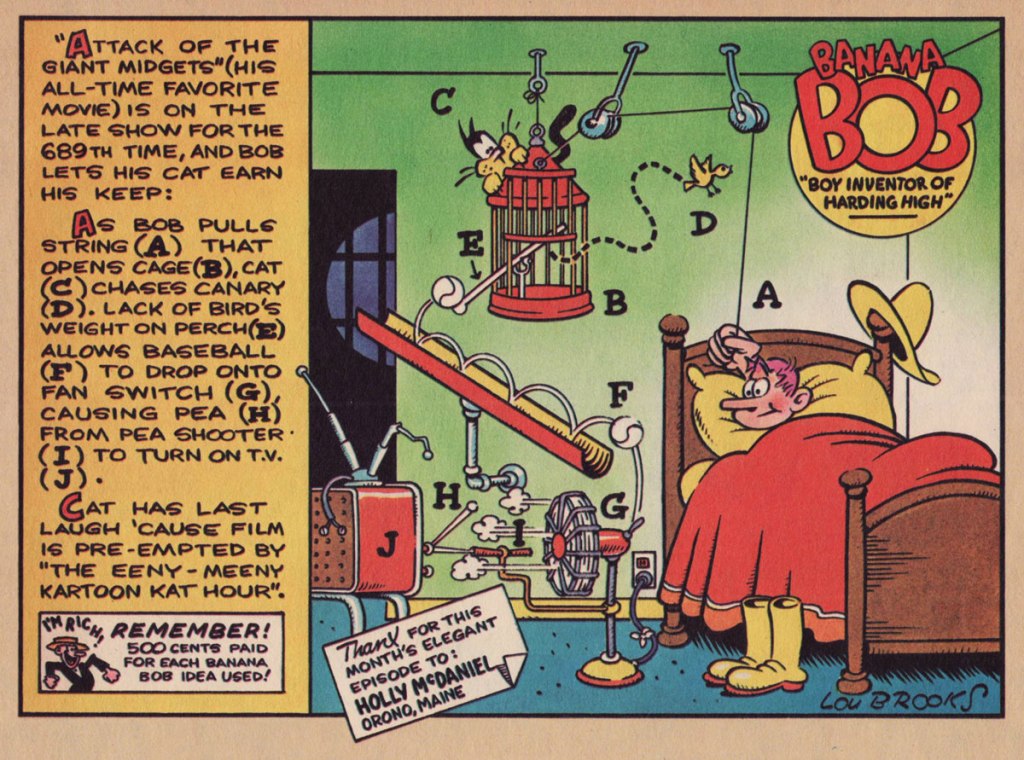One of Brooks’ earliest jobs in the badlands of professional cartooning was a strip he produced for Scholastic‘s Bananas (1975-84), a skewing-slightly-older companion to the publisher’s big hit Dynamite (1974-92). Banana Bob, “Boy Inventor of Harding High” exploited the time-honoured gizmo formula hatched in 1912 by Rube Goldberg with the twist that here, the doodads were contrived by readers and given visual interpretation by Brooks. Banana Bob ran for the mag’s first twenty-nine issues.