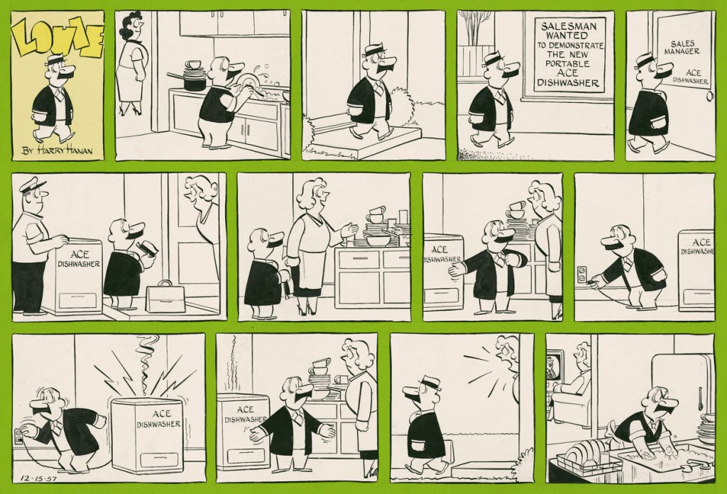 I’ve talked about Harry Hanan‘s Louie before (see Louie Reads Some Ghastly Comics), but as this post dates from the early-ish days of WOT, it included only one image. My opinion of it has also changed. I called it an ‘endearing’ strip, but I’ve come to feel that the overall effect of watching this schlemiel fail at absolutely everything, day after day, is rather bleak. On the other hand, this daily drudgery makes his rare moments of joy stand out in stark contrast.