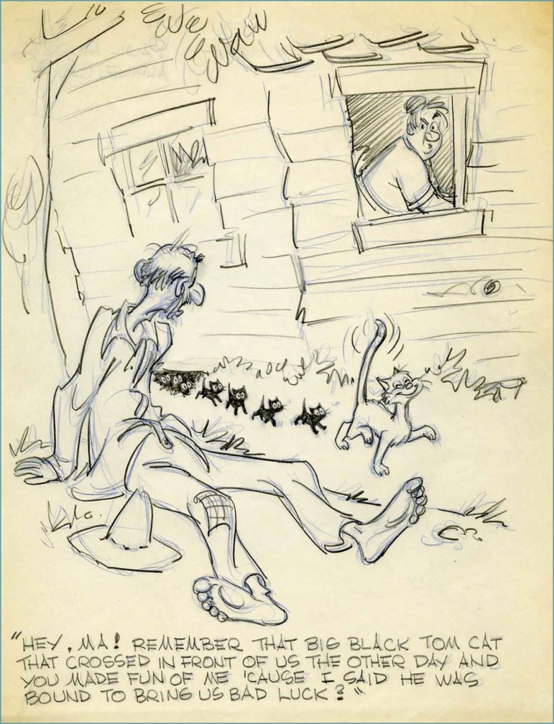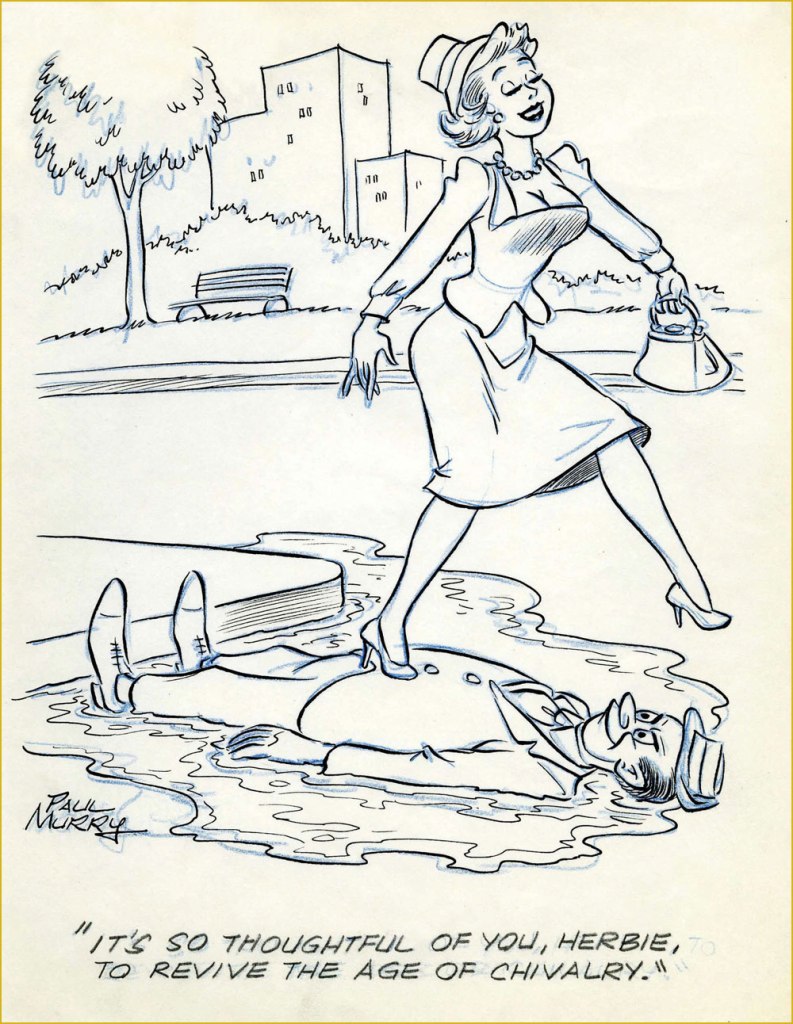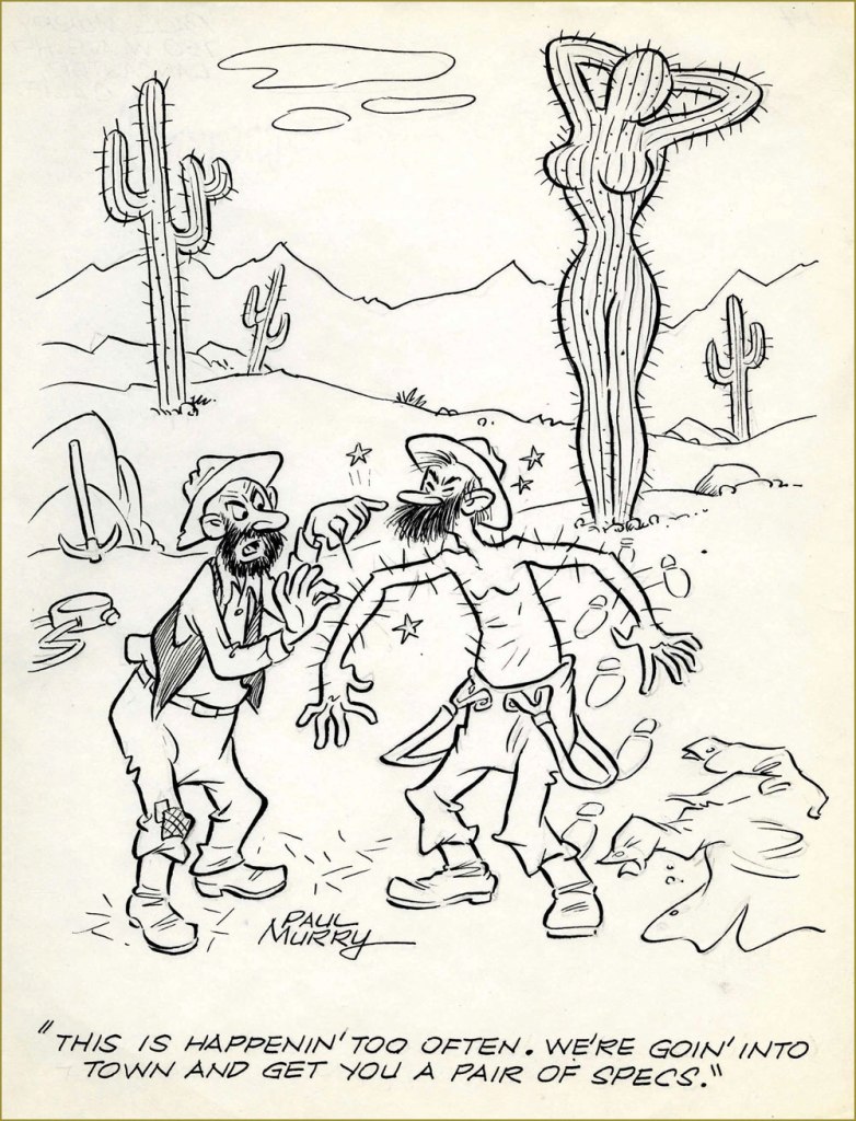 Murry also drew girlie cartoons, and quite good ones, too. Working in animation yields handsome artistic dividends, but one might also say that Murry, with his discerning eye for dynamic anatomy, was made for it. Here’s a batch of them from the 40s and 50s.