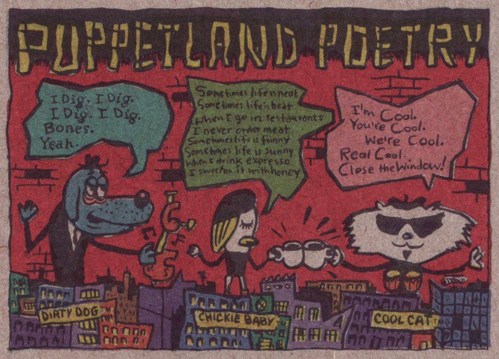 This is happily one of those rare occasions when the word ‘Fun’ is accurately evoked. While Mr. Reubens wasn’t directly involved with the conception and concoction of this splendid ‘Pak’, he signed off on every aspect of it — no generic licenced product, this.While the front of the cards bore the standard, time-tested ‘photographs with captions’ images, the backs is where the anarchic action was. Here are a few samples. Note the unbleached cardboard, which adds a certain primitive je ne sais quoi.“Remember — you are an ARTIST!”The Puppetland Band, those adorable beatniks, were always favourites.Cartoonists Mark Newgarden and Kazimieras ‘Kaz‘ Prapuolenis write in!