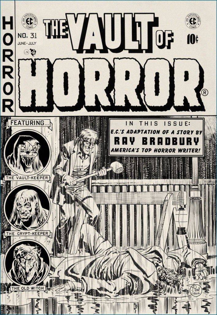 It’s a bit incongruous that what must be EC Comics’ quietest, most ruminative horror story should appear under one of its most violent (‘hard hitting’ comes to mind… literally) covers. Johnny Craig’s work could be — and generally was — quite understated, but on days when he wasn’t in that particular restrained frame of mind… look out! This is the original cover art from Vault of Horror no. 31 (June-July 1953, EC).