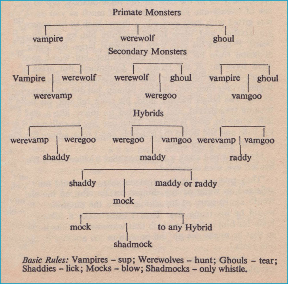 Among the most intriguing features of Chetwynd-Hayes’ book is his clever conceit of monsters forming an oppressed (by humanity) society with its own castes, hybrids, classifications and creeds. Here’s a most helpful table: