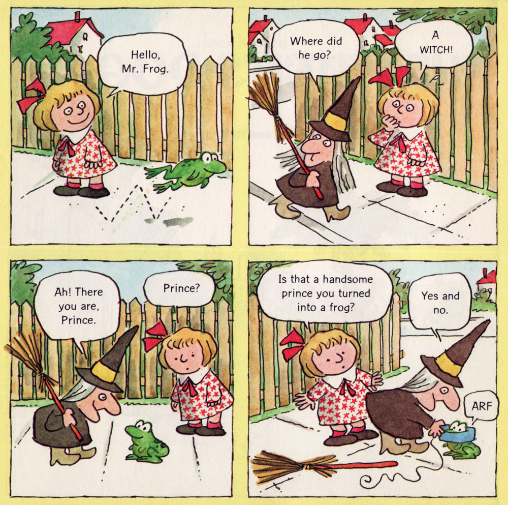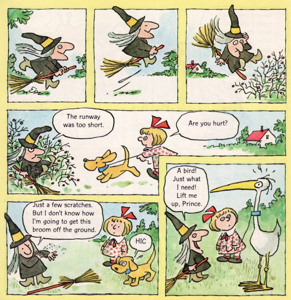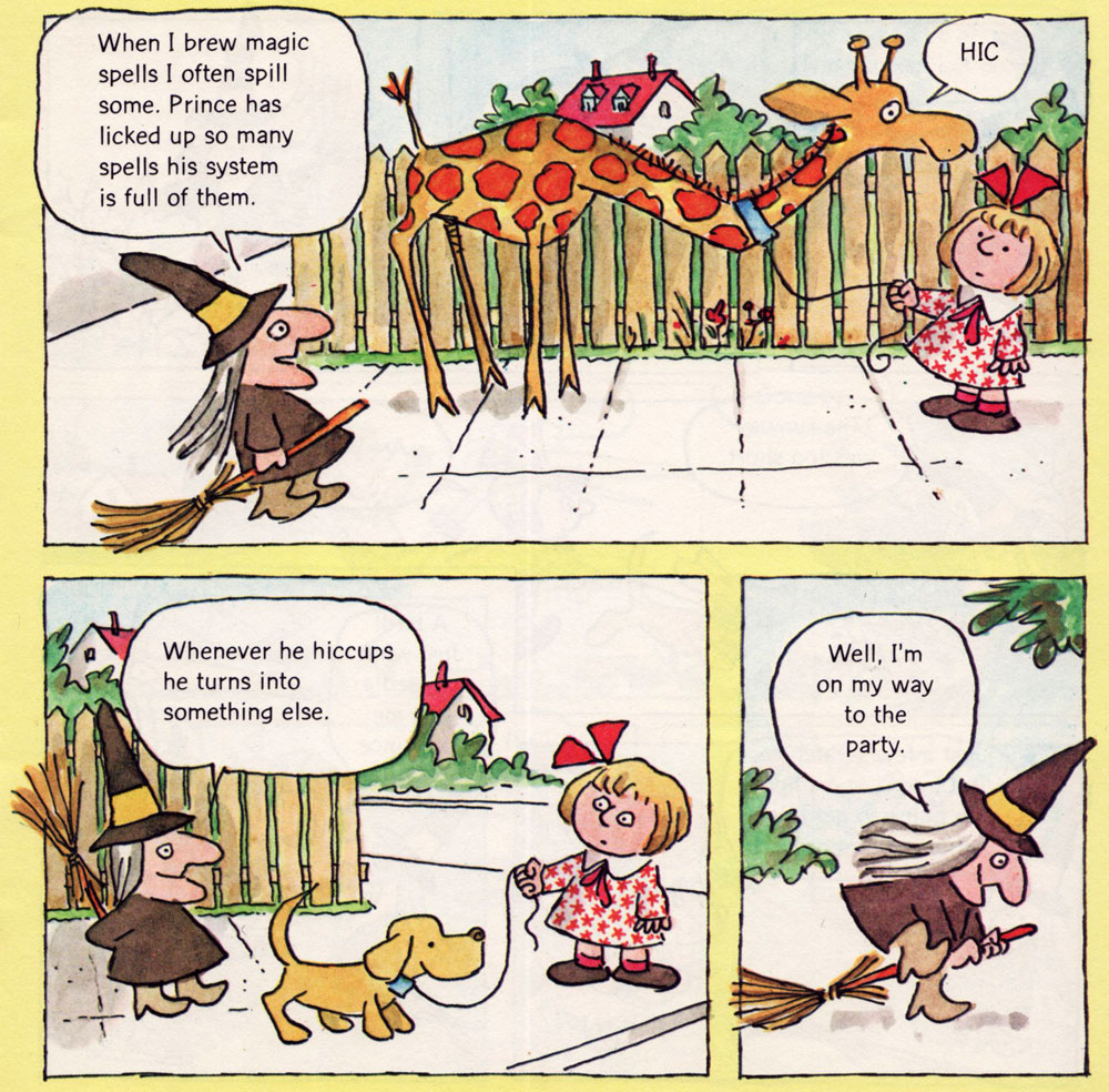 In the meantime, and since it is very much of the season, let us concentrate on the short, but no less lovable for its length, Cindy Lou and the Witch’s Dog, a children’s book (well, nearly more of a booklet) from 1978. Aside from the presence of a witch in the tale (as announced by the title), it also features hiccupping as a main plot point, a state of things close to my heart as I am quite prone to this affliction, though I fortunately do not undergo metamorphosis with each involuntary contraction of the diagram. Here’s a factoid of the day: the medical name for hiccup is singultus, from the Latin singult which means ‘to catch one’s breath while sobbing’. My grandmother always thought there was something profoundly wrong with me with all these hiccups… but then she was also convinced I’d grow up to be an alcoholic from sharing an occasional beer with my dad, so perhaps her forebodings can be dismissed.