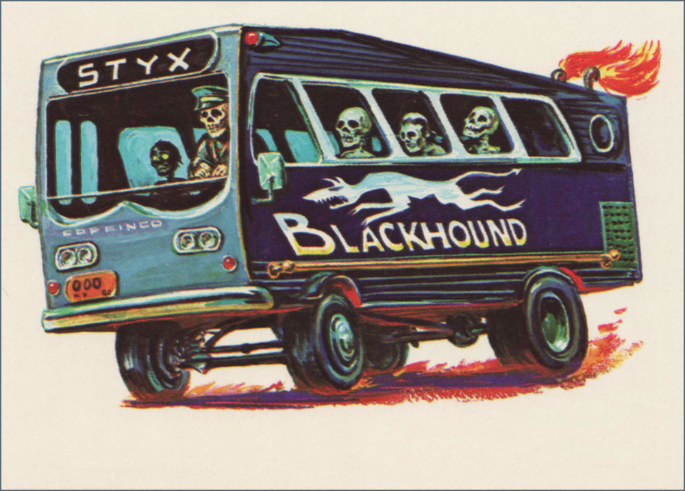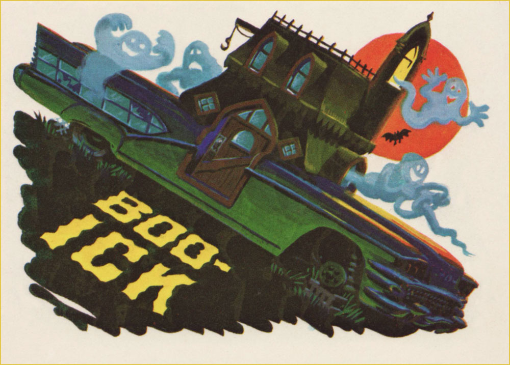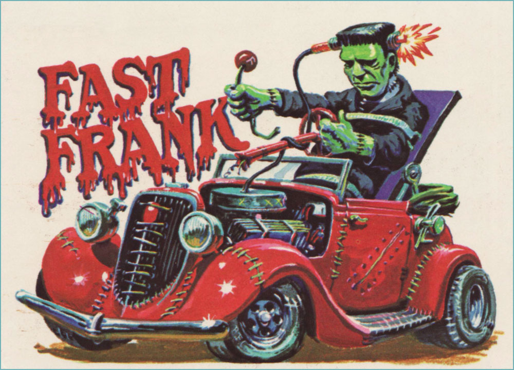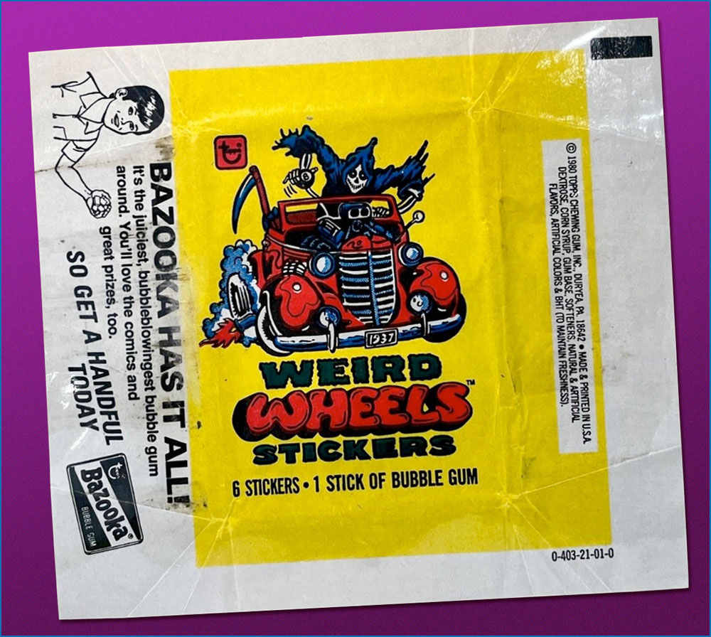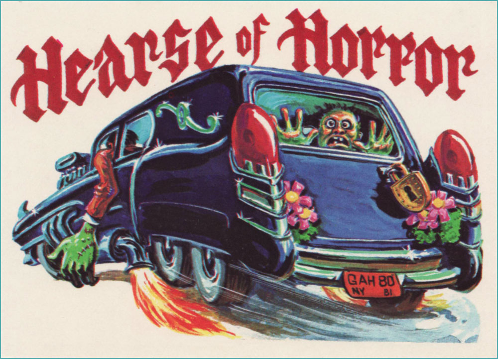 While my co-admin ds has already touched upon the circumstances of Topps’ Weird Wheels in her Purple Tentacle Tuesday post, she was of course thematically constrained there… while I’m free to drill down deeper into the set’s considerable riches. I won’t recount the set’s history, as that haunted ground has long ago been exhaustively explored and trod upon by the mighty Kurt Kuersteiner, monster gum card historian and also owner, operator and distinguished curator of the Jack T. Chick Museum of Fine Art. Peruse at your peril his fine account of what went down when Weird Wheels came down.
