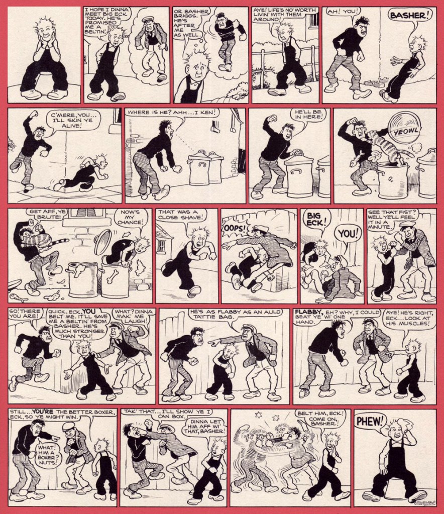« […] the use of the dialect reflected the publisher D. C. Thomson’s ‘realist’ editorial policy and focus on authenticity. It was intended to attract a large Scottish urban audience and in this was really successful. Both strips were massive hits and at their peak had an estimated readership of three million (79% of the adult population of Scotland!)
