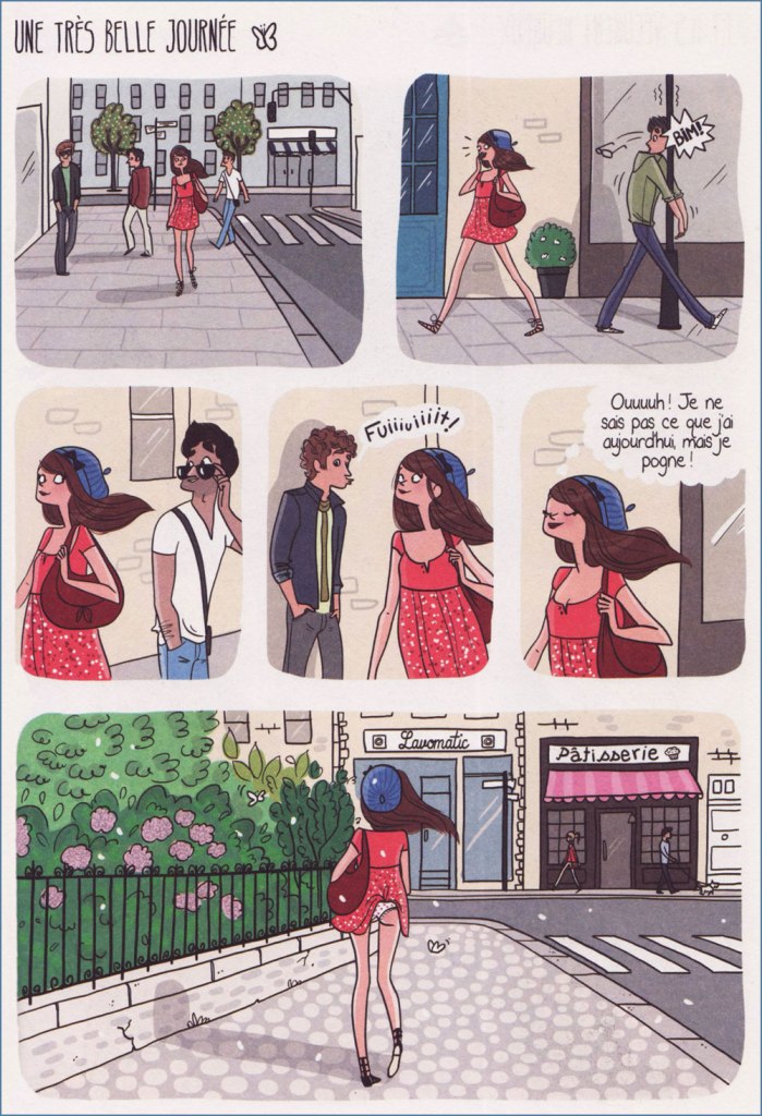 Since I made a point of mentioning artists with similar styles, here’s an example. The following pages have been scanned from La célibataire, written by Quebecoise India Desjardins and illustrated by French Magalie Foutrier (although given how light in storytelling content this book is, and how very French it is, too, I’m not really sure what Desjardins actually contributed):