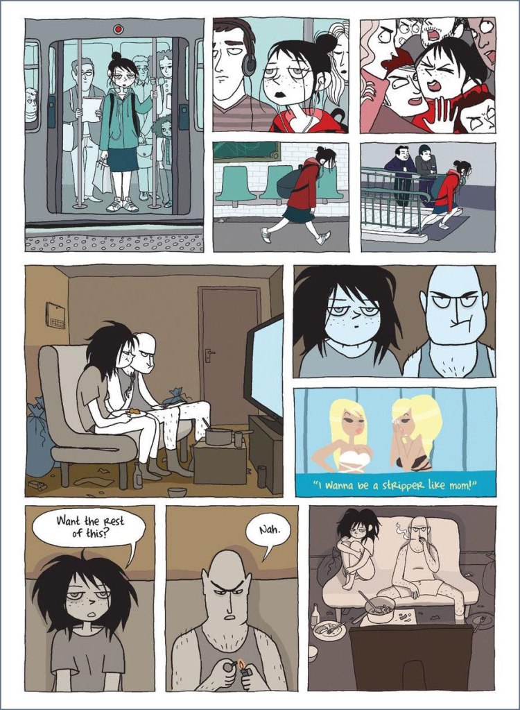 Her other graphic novel I like, La page blanche (2012), was written by Boulet and remains untranslated into English. It opens with a young woman sitting on a bench, having no idea how she got there or who she is. The interesting thing is that her amnesia never goes away — she never gets to remember anything about her past life, or discover who she was. All she finds was an apartment full of books that everybody reads and movies everybody watches, as well as shallow friends who are not really friends.