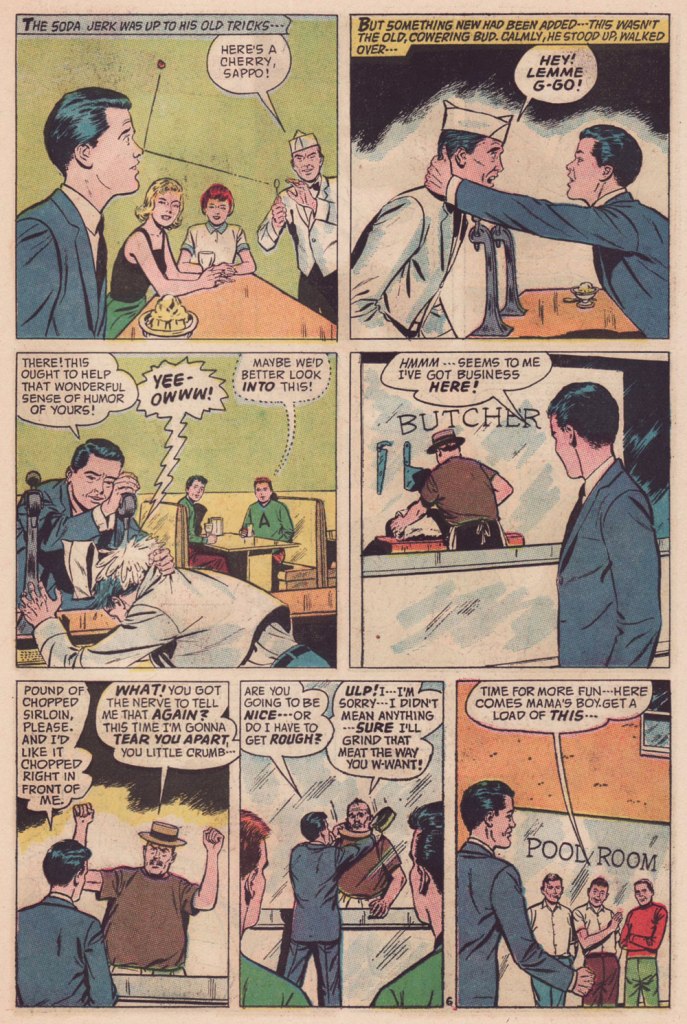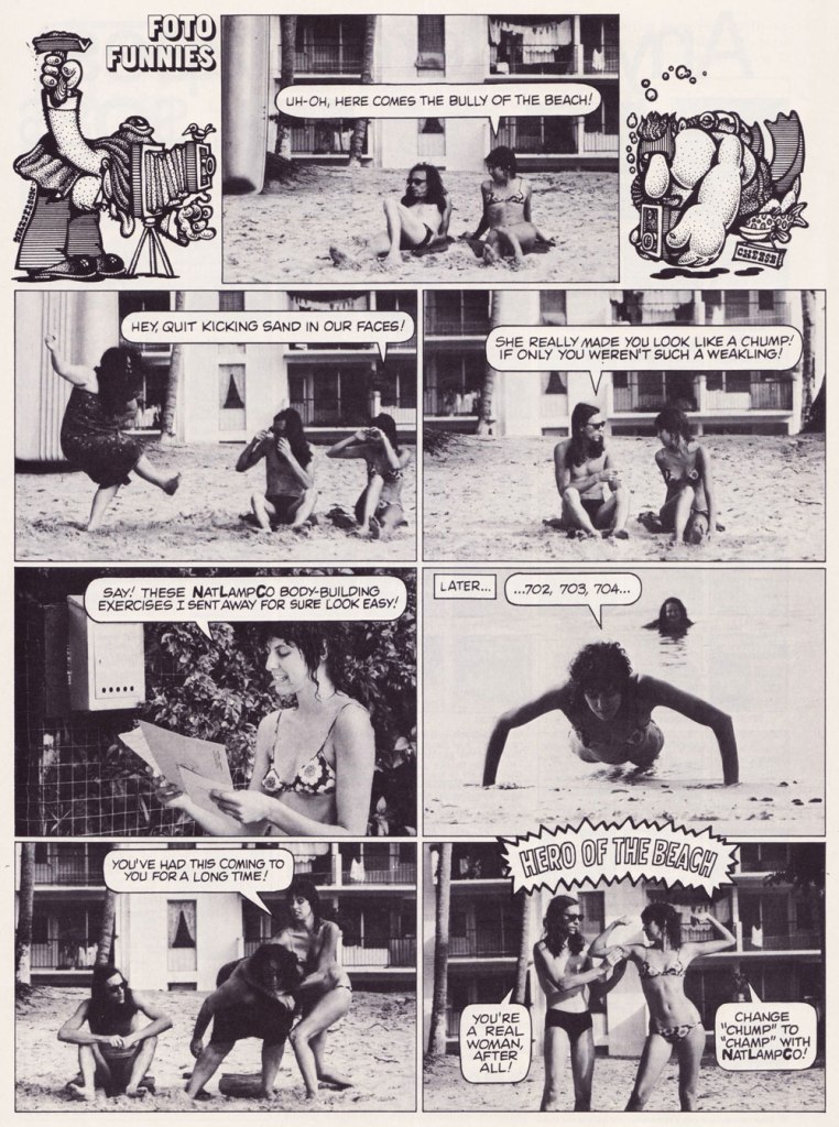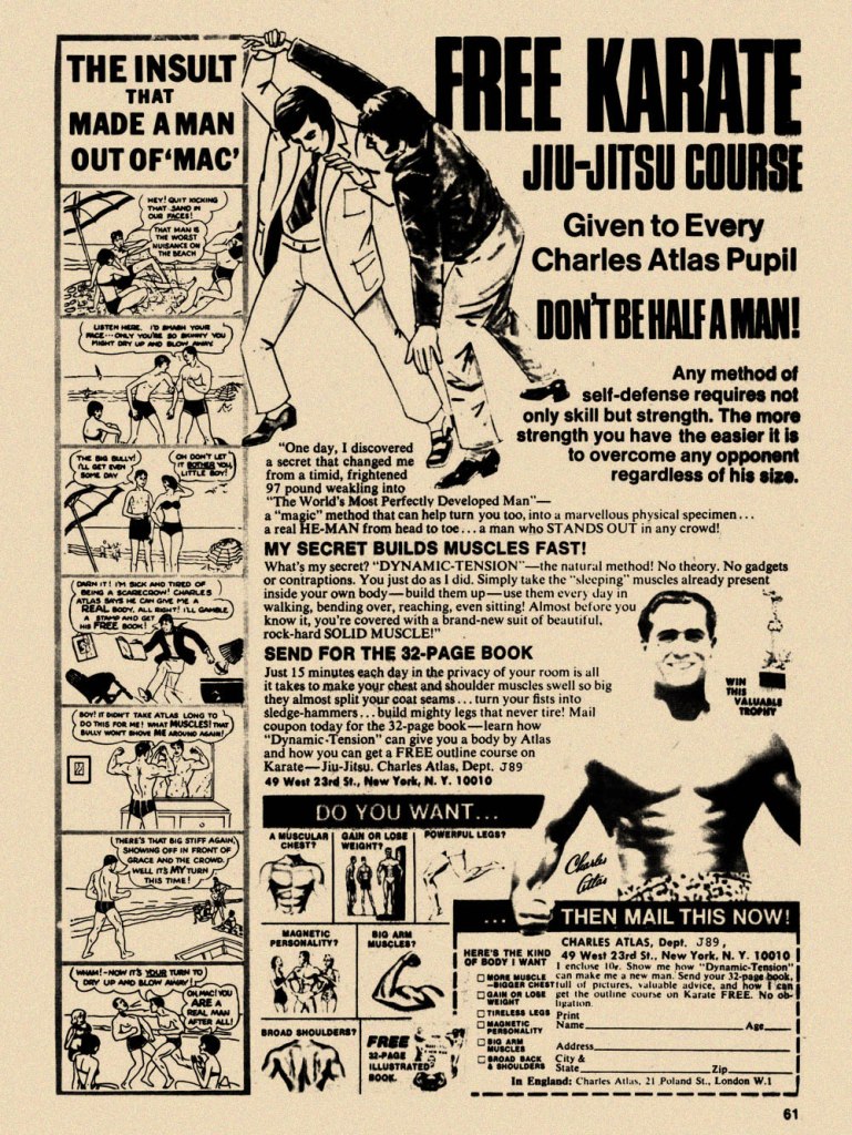 While the Charles Atlas ads began running in the 1930s, this is probably their classical expression. This one saw print as the back cover of Mad no. 14 (Aug. 1954, EC). Its opening insult even inspired Miles Heller’s 1995 salute to the great old comic book ads, Hey Skinny!There was inevitably fierce competition in the self-improvement field. This entry, from the U.S. Nature Products Corp., appeared in Stan Lee’s oh-so-macho Man Comics no. 10 (Oct. 1951, Atlas).Lots and lots of copy — but the all-important cartoon hook is present and accounted for. From the pages of Firehair no. 9 (Fall 1951, Fiction House). The Jowett Institute of Physical Training wants you to get buff! To be fair, George F. Jowett got there first.This is surely the definitive version, with the unforgettable tag line and ‘hero of the beach’ conclusion. I pulled this one from The Witching Hour no. 25 (Nov. 1972, DC), which hit newsstands just a few months before Mr. Atlas passed away, aged 80, on Christmas Eve. I can’t help being amused: French publisher Arédit, whose digest-sized collections of (mostly) reprints of US comics proudly bore the tag « Comics for adults », featured very few outside ads… and those were almost exclusively for self-defense and body-building systems. Here’s a sample trio. This one appeared in Maniaks no 4 (Fall, 1971). This title featured reprints of DC Silver Age ‘humour’ comics… all but the only actually funny one (that would be Sugar and Spike, of course).Oh, I’m sure the ERB Estate got their cut. And who might that R. Duranton fellow be? Four times Mr. France, for one thing! Here he appears with Louis de Funès in a famous scene from Le Corniaud, a 1965 farce starring beloved stars André Bourvil / De Funès and directed by Gérard Oury. This one’s from Kamandi no. 4 (Summer 1976, Artima), which featured reprints of various 60s and 70s DC adventure comics. It was an affordable way to catch up on material one might have missed — or couldn’t afford!This refreshing gender-switched lampoon comes from the pages of National Lampoon no. 26 (May, 1972), the ‘Men!’ issue, guest-edited by Anne Bats, No other credits, dammit. The opening page (of four) of Steve Skeates and Sergio Aragonés‘ wacky satire, from the pages of Plop! no. 2 (Nov.-Dec. 1973, DC). There have been truly countless spoofs of the Atlas adverts… most of them quite dire. Once more, I’ll spare you.By the mid-1970s, with America in the kung-fu grip of martial arts fever, it’s understandable that many a young man was envisioning Bruce Lee‘s lithe, compact physique as an alternative to the hulking musclemen of yore. The Charles Atlas company tried to cover all bases with this ad; from — speaking of old-time musclemen — Doc Savage no. 2 (Oct. 1975, Marvel).