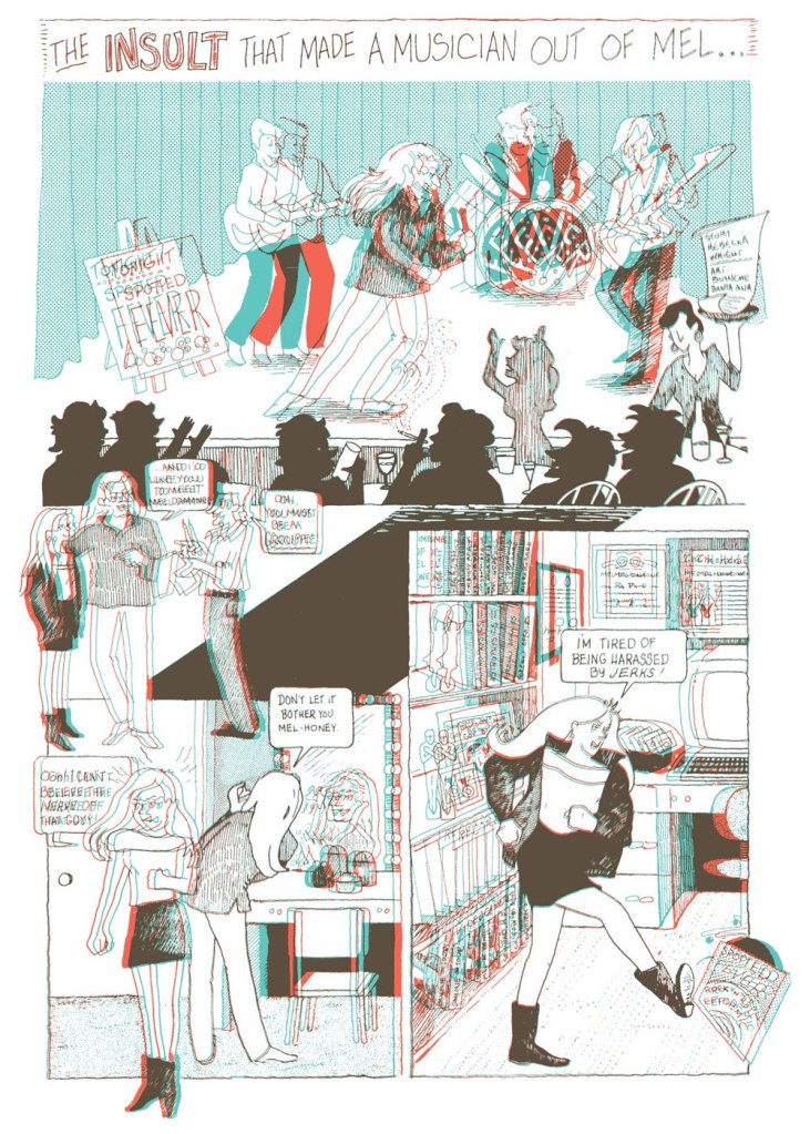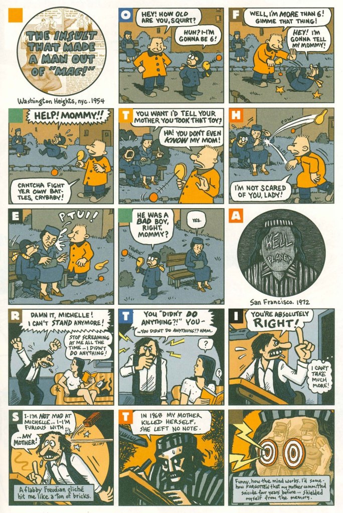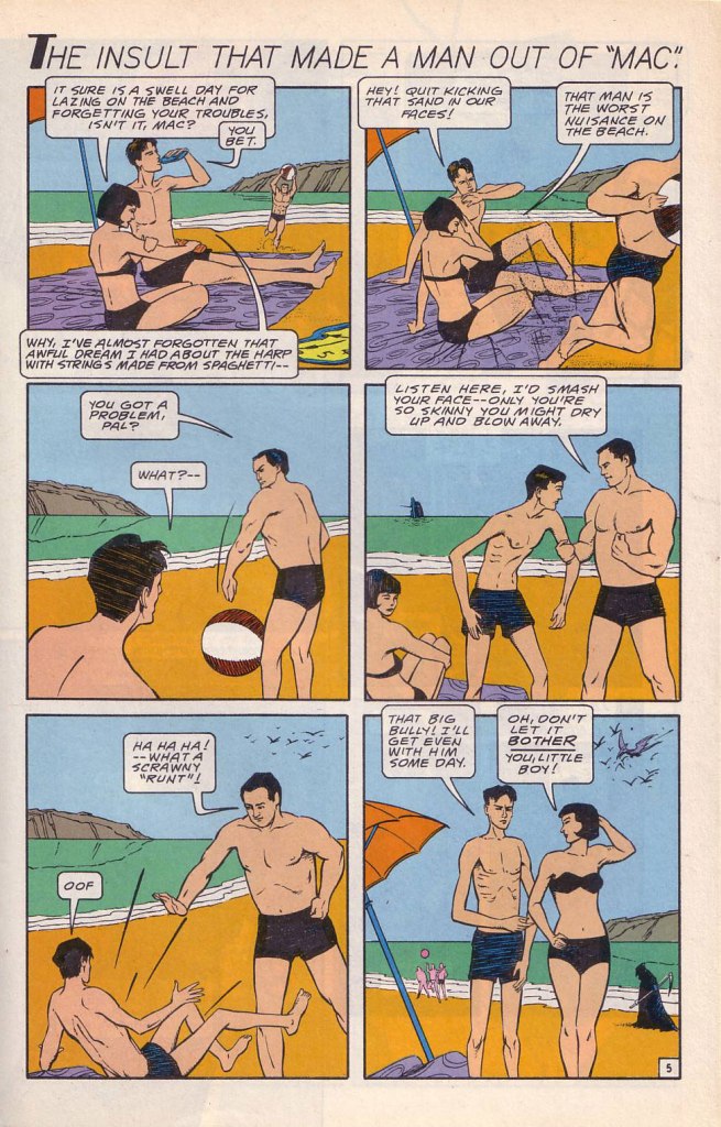 Ah, yes — those days when ‘Bruce‘ was the stereotypical gay name. From the ‘Playboy Funnies’ section of the magazine’s November, 1977 issue.And for something a bit off the beaten path: this is The Insult That Made a Musician Out of Mel, scripted by Rebecka Wright, illustrated by Blanche Santa Ana, with 3-D effects by Ray Zone, from Wimmen’s Comix no. 12 (Nov. 1987, Renegade Press), edited by Angela Bocage and Rebecka Wright.Does this look familiar? This is the first page of Flex Mentallo’s origin tale, as it appeared in Doom Patrol no. 42 (Mar. 1991, DC), written by Grant Morrison, with art by Mike Dringenberg and Doug Hazlewood. I have no idea whether Atlas had a sense of humour, but his successors sure didn’t, as evidenced by the lawsuit they filed against DC Comics over this clear — if brazen — case of satire. I much prefer the TV show version of Flex, I confess.Peter Kuper deftly used the cliché to take a jab at George Bush Sr.’s image and the first Gulf War. Dated and irrelevant? Trying to prove your ‘manhood’ remains distressingly au courant… just consider these two schmucks, to cite but one recent example. And hey, here’s “Stormin’ Norman lying on T.V.” From Bleeding Heart no. 1 (Winter 1991-92, Fantagraphics).Art Spiegelman digs deeper and makes more discerning use of the raw materials at hand with The Insult that Made a Man out of “Mac!”, first previewed in The Virginia Quarterly Review and then collected in Breakdowns Portrait of the Artist as a Young %@?*! (Oct. 2008, Pantheon).