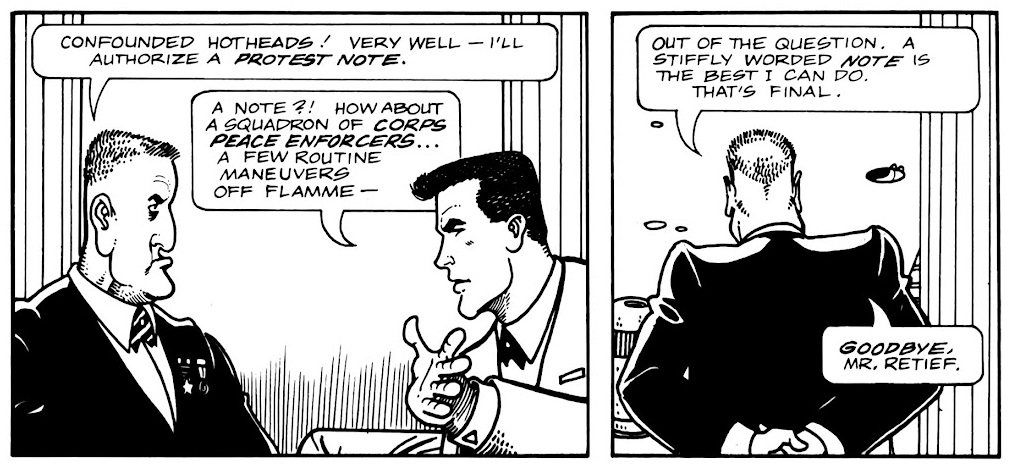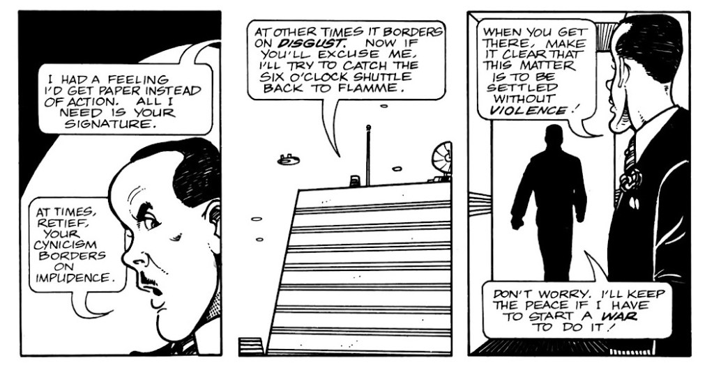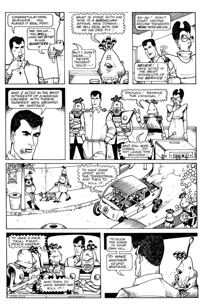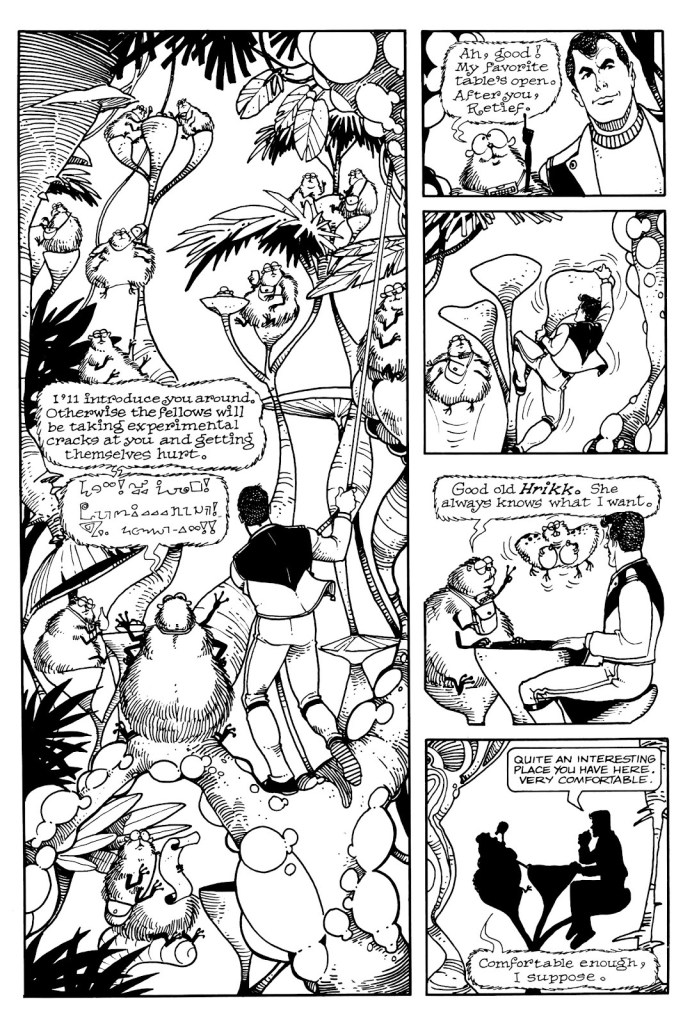 Page from Saline Solution, published in Keith Laumer’s Retief no. 4 (October 1987). Retief may be a rather refined sort with a taste for fine wine and his own brand for diplomacy, but he does not hesitate to mingle with the plebeian masses – or side with the underdog, which Sam here is a representative of.