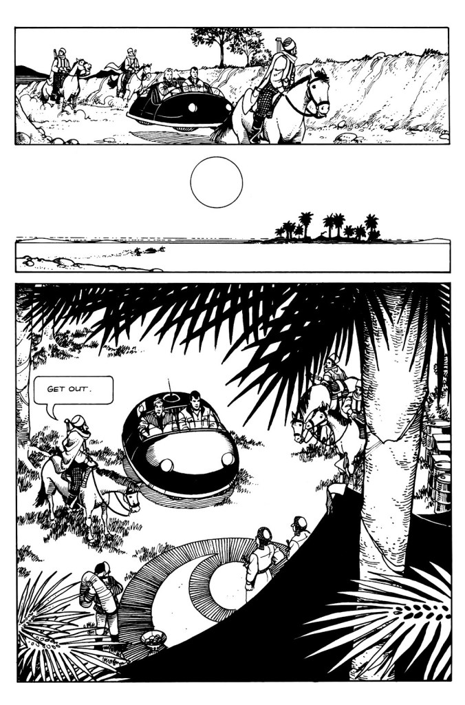 Page from Protest Note, published in no. 3. Retief visits a variety of environments, and Fujitake draws them all with equal conviction.