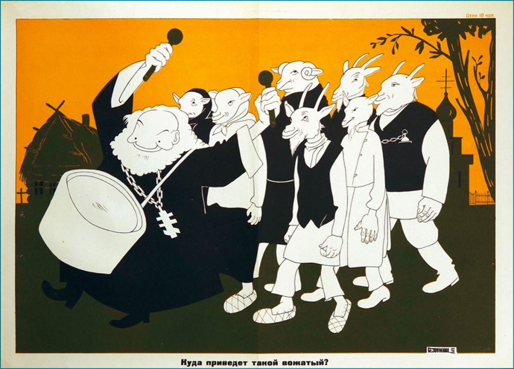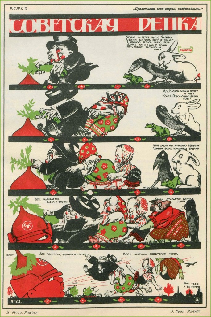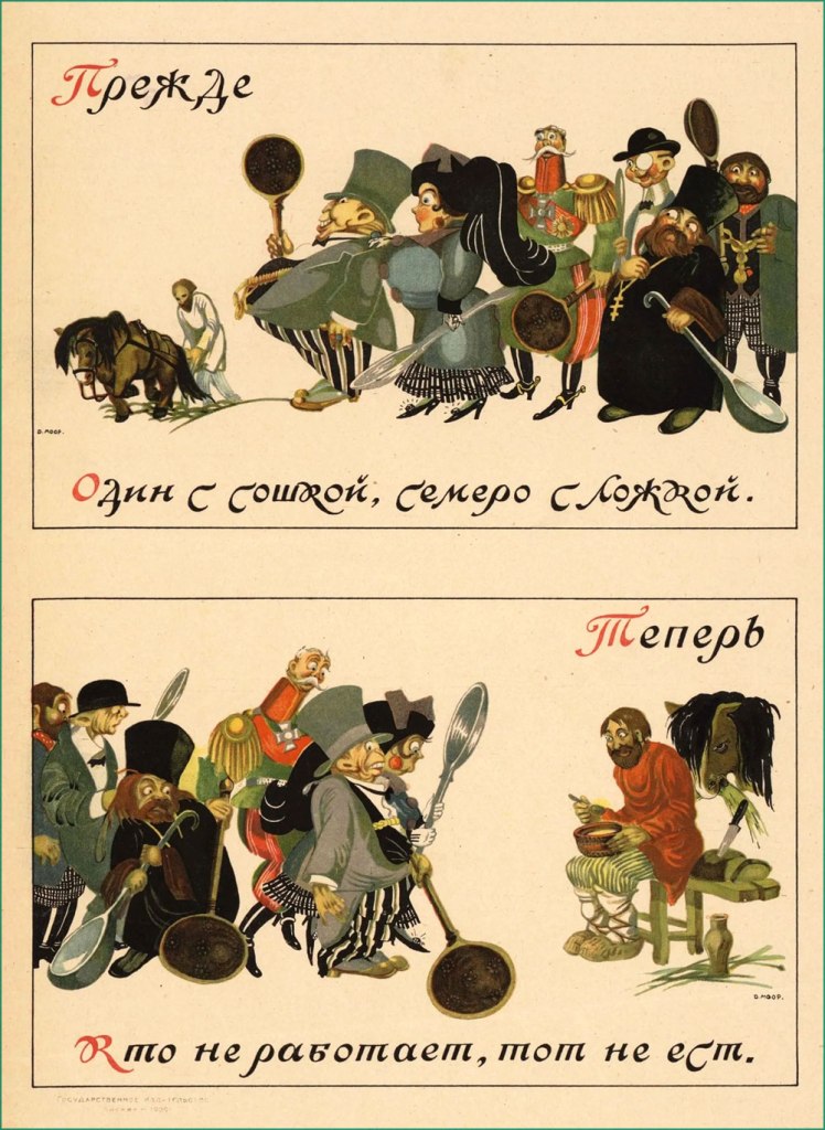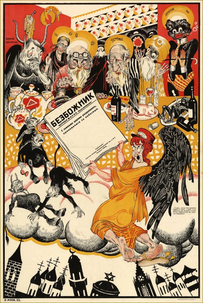 Alongside his active production of posters, D. Moor continued his career as a political caricaturist, publishing his anti-religious work in The Godless at the Workbench magazine (Безбожник у станка) — nice title, isn’t it? — and regularly contributing to various satirical magazines and communist newspapers, such as Pravda or Krokodil.
