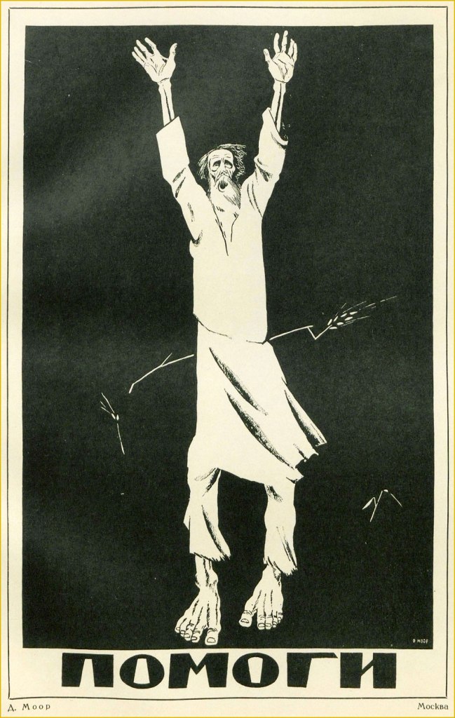 Orlov adopted his pseudonym in 1907, when he switched careers from typography to political cartooning after one of his caricatures was printed in a newspaper. His biting sense of humour was not always well received by the Tsarist régime, and occasionally censored, which provoked the passionate Orlov into even more acerbic mockery. In these years he also designed posters for silent films, which in a way forecast his future as an affichiste. After the Russian Revolution of 1905, Orlov joined the ranks of those actively working in favour of an uprising; when in 1917 Russia fell into civil war that would lead to the formation of the USSR, D. Moor put to good use his aggressive anti-religious stance and talent for caricaturing politics.